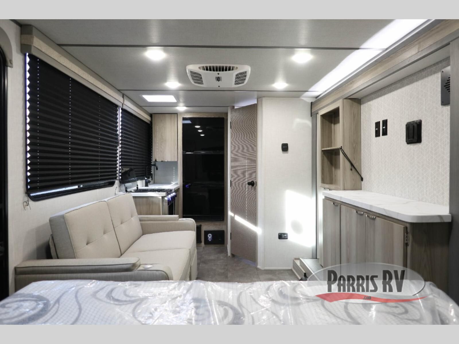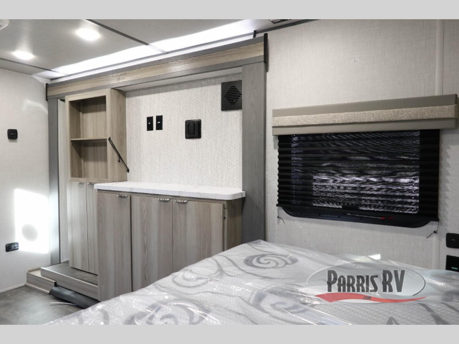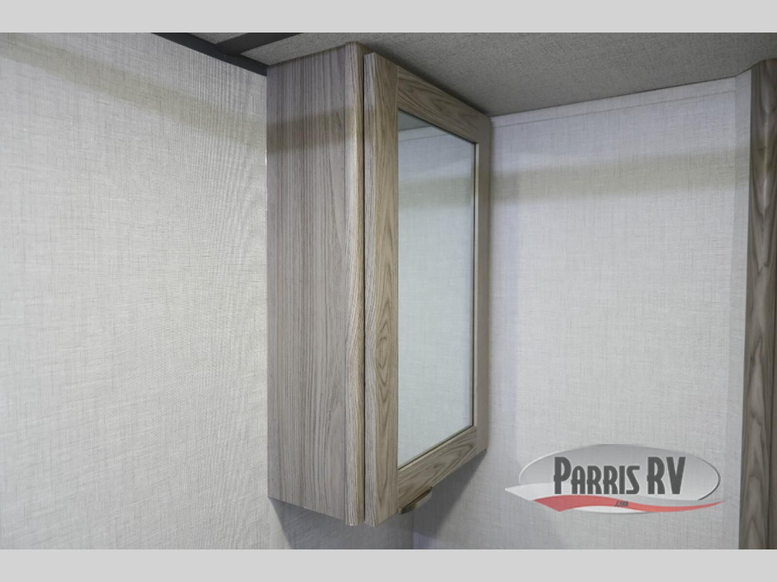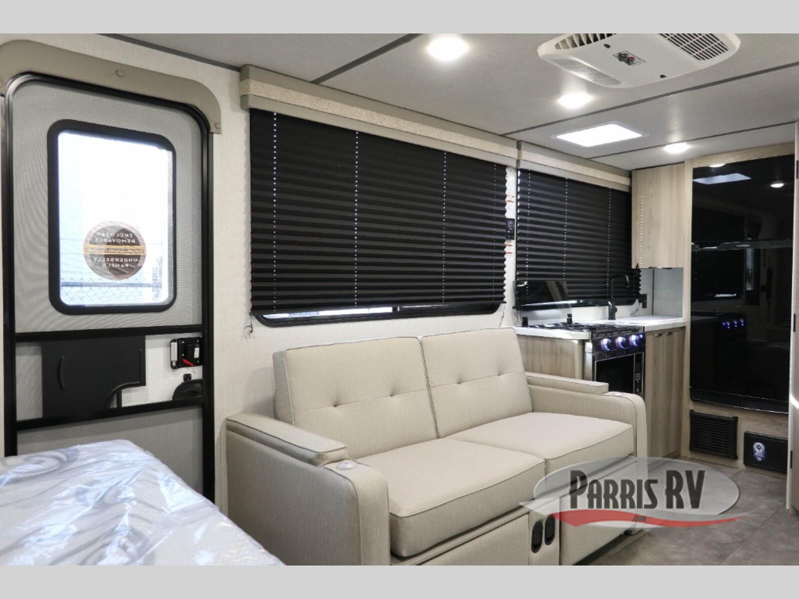 Perfect for your family, this single slide with split bunk and queen bed provides your family comfortable sleeping for four, and the slide adds a bit more interior space in camp. The split bunk is located behind the spice rack door and TV for your entertainment and cooking needs. Speaking of cooking, you can prepare your best home cooked meals with the cooktop, and store any leftovers in the dual swinging 12V refrigerator. Relax each night in the theater seating and freshen up in the rear corner bathroom each morning which features a skylight over the shower for more natural lighting.