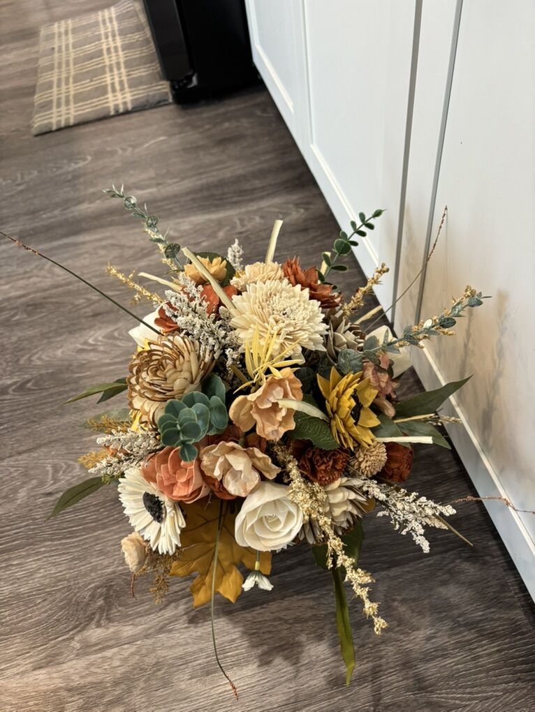 VenmoThis cascading fall bridal bouquet is designed with wood flowers and artificial greenery.