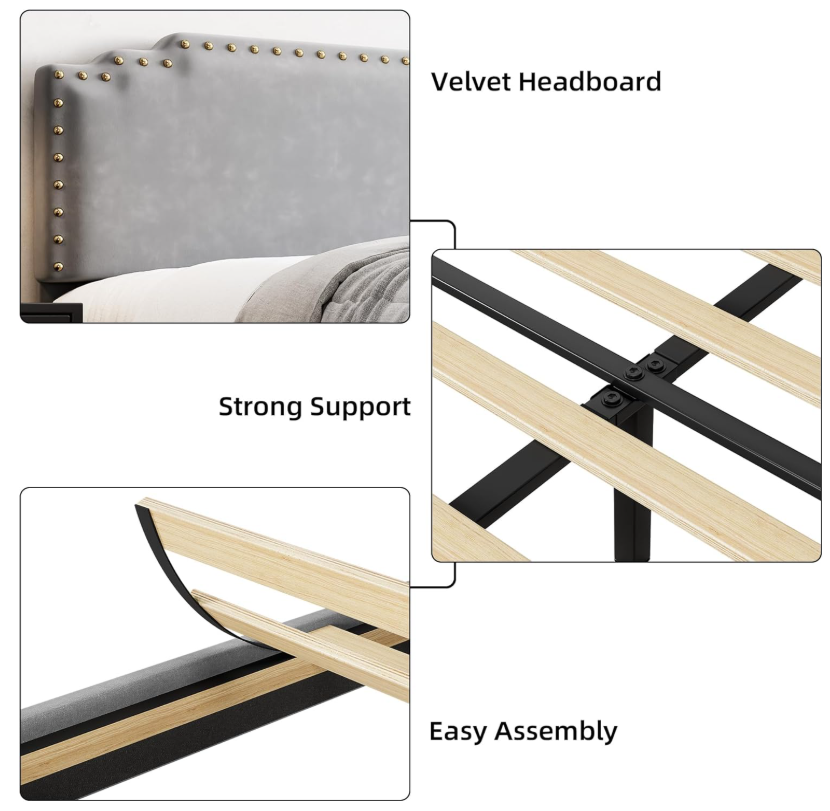ZelleSturdy and Noise-Free Support:Designed for strength, this heavy-duty bed frame features a metal structure with sturdy slats, supporting up to 1,000 lbs. It eliminates the need for a box spring and accommodates mattresses between 8-12 inches, ensuring a comfortable sleep environment.