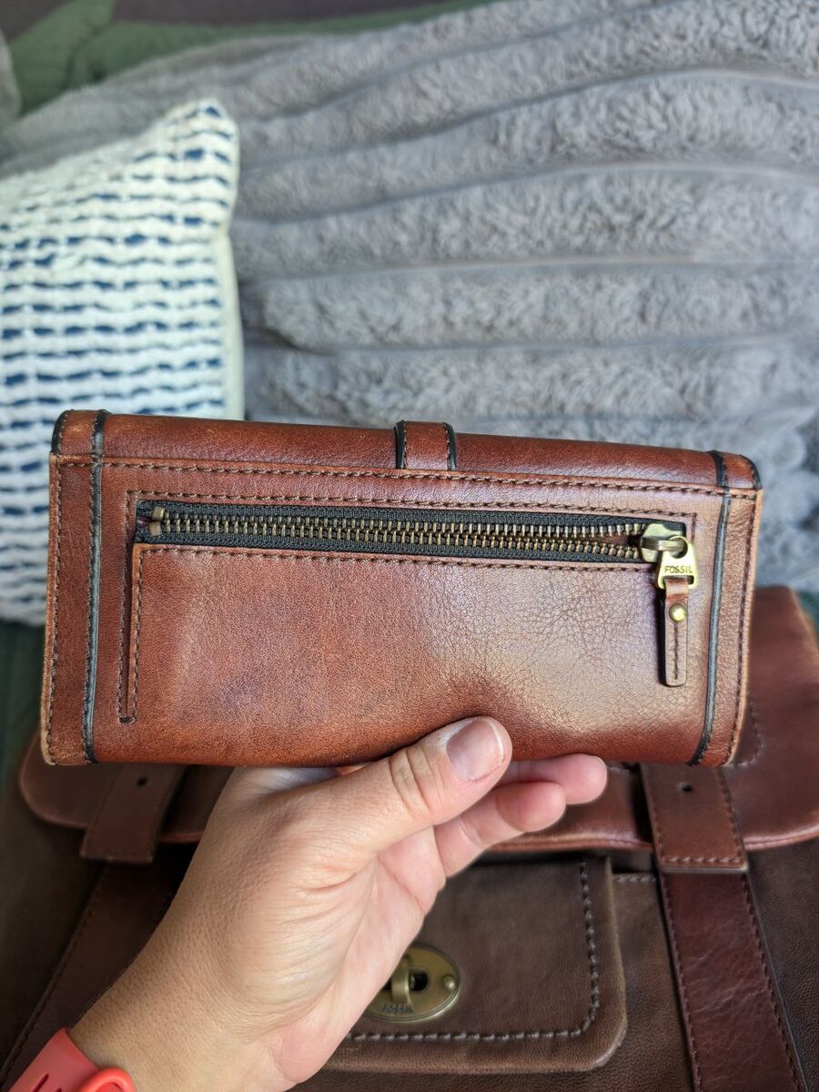 This beautiful set is in great condition. The purse is large and spacious with a comfortable top grab handle or shoulder strap. There are organizer pockets on the inside and outside. Metal clasps keep everything tucked safely inside.