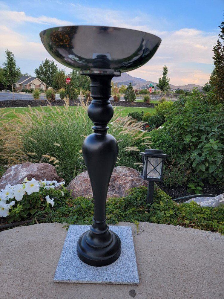 Stunning high-end bird bath featuring a gorgeous large pewter bowl with intricate mother of pearl mosaic interior! Elegant black pedestal sits on a solid marble base for ultimate stability and sophistication.