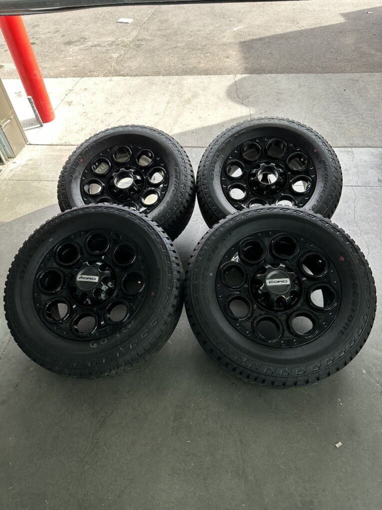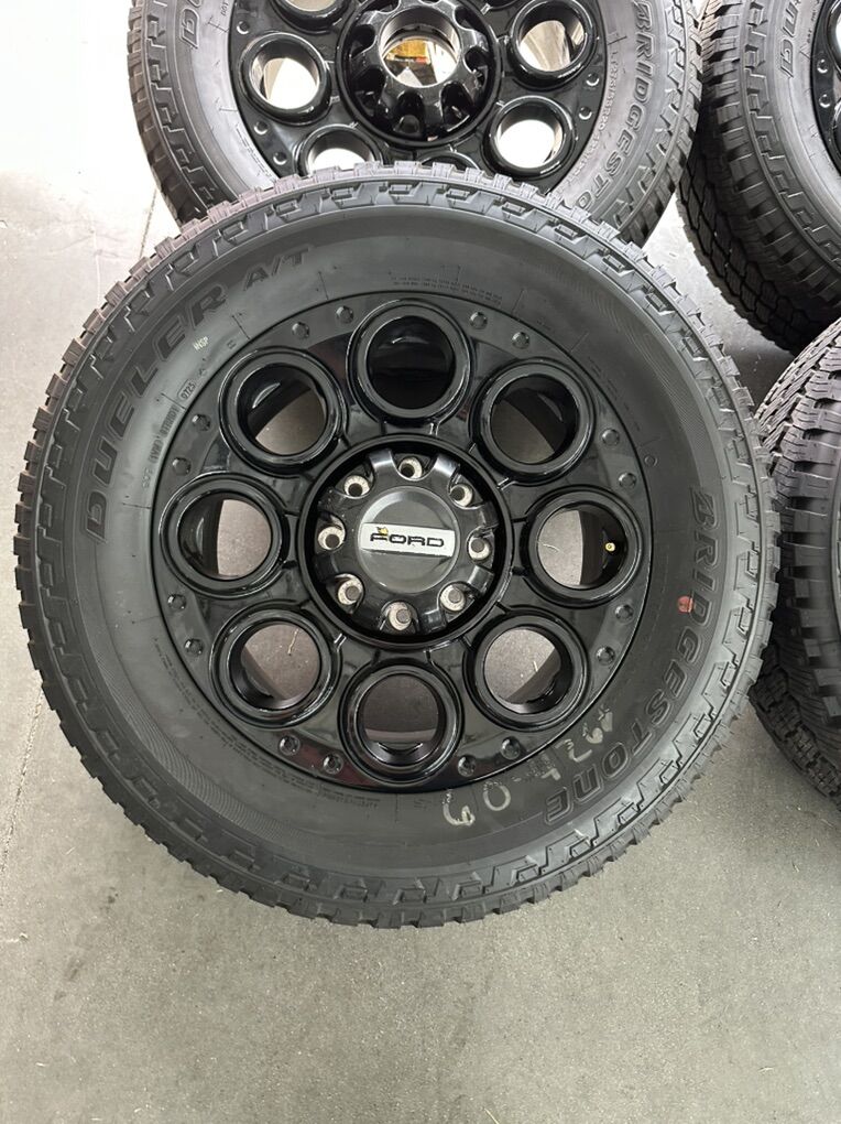 Wheels are 20in OEM wheels off a 2026 ford f350 sport FX4 upgrade package. Amazing looking set of all black 20in superduty takeoffs, they are in like new shape, no curb rash, dings or major damage on them, all the center caps are also included and in perfect shape as well. Tires are 275/65/20 Bridgestone dueler all terrain, load range E, top of the line, all terrain tires, no patches or plugs in them, tires have less then 25 miles so they are brand new.