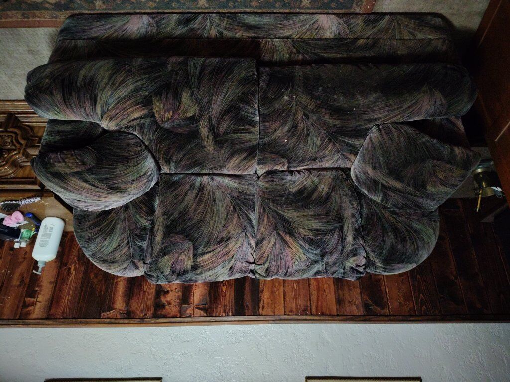 PRICE REDUCED MOVING SALE.. love seat and couch black veriegated material couch in very nice shape. COMES WITH COFFEE TABLE DON'T HAVE PITCHER YET...