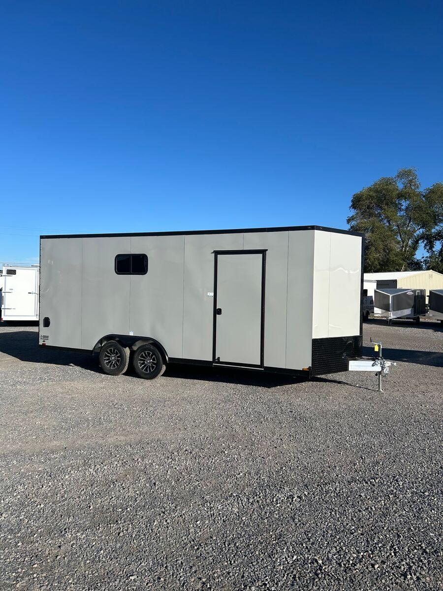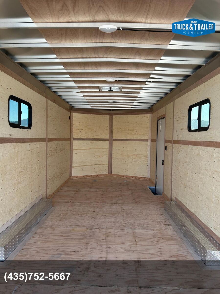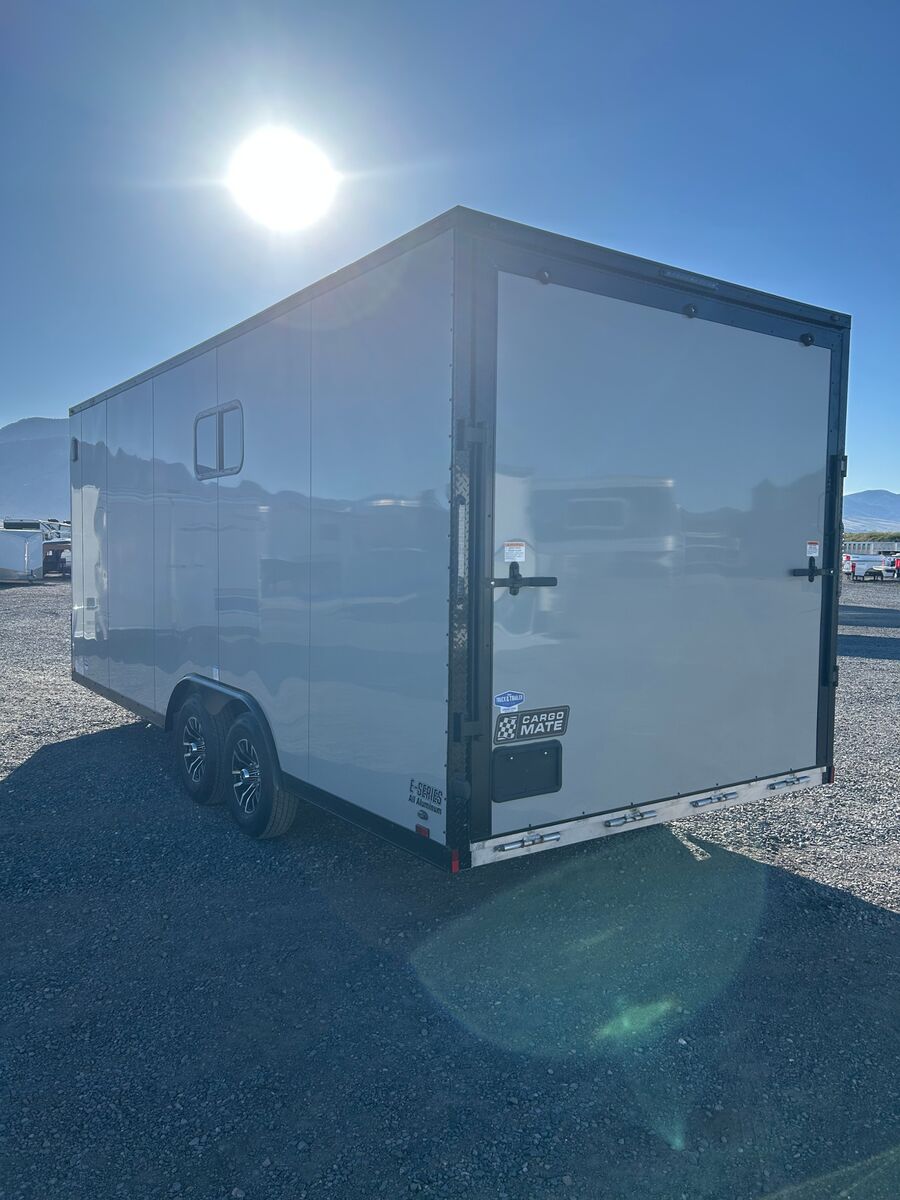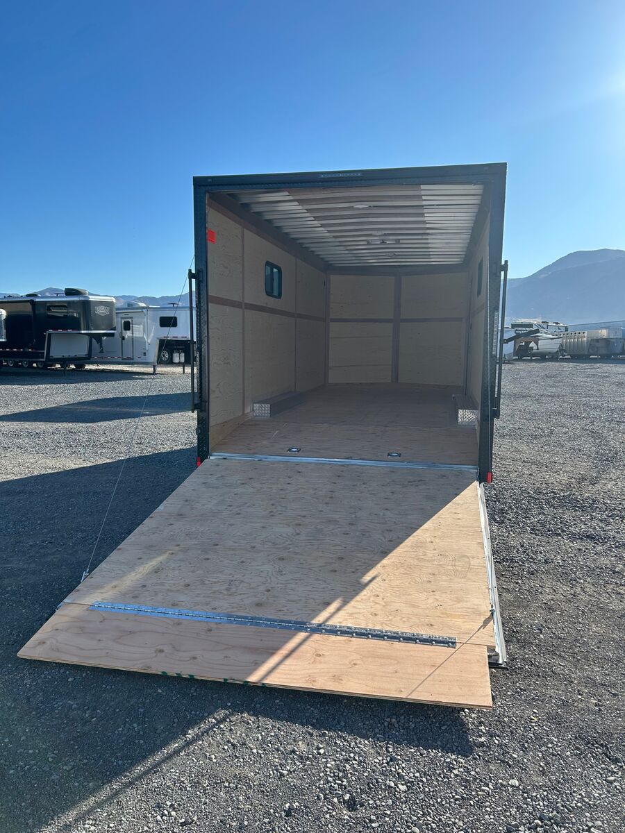 8.5X20 Aluminum Frame Trailer Black Out Package Windows 5K Axles with 15" Aluminum Wheels and Tires 24" Wedge Front 16" Centers on Floor and Walls Triple Tube Tongue Screwless Exterior with Windows Rear Ramp Door