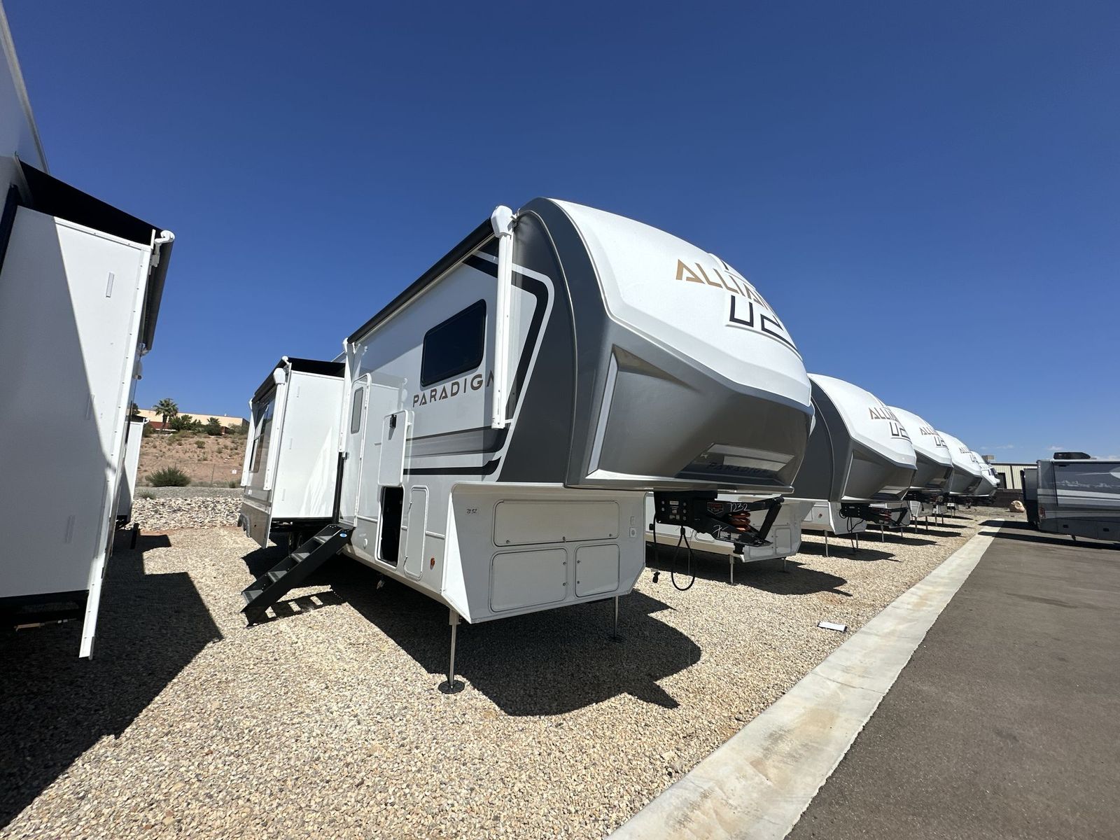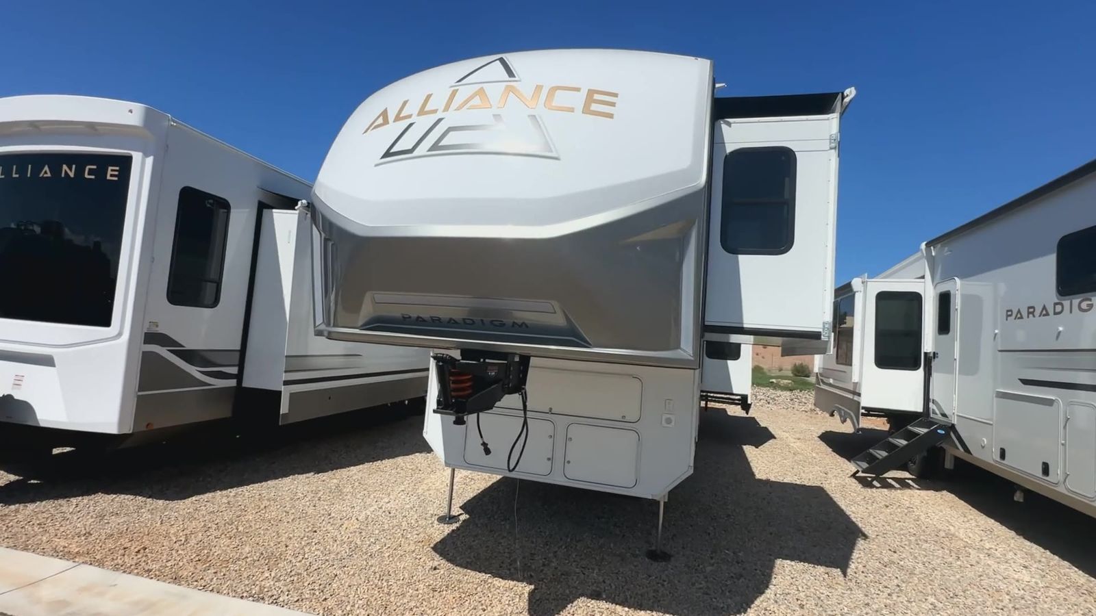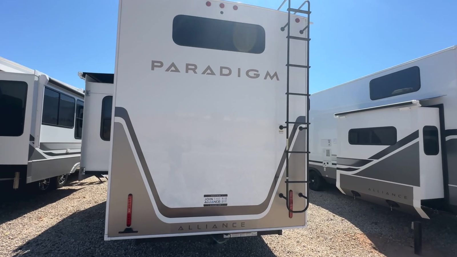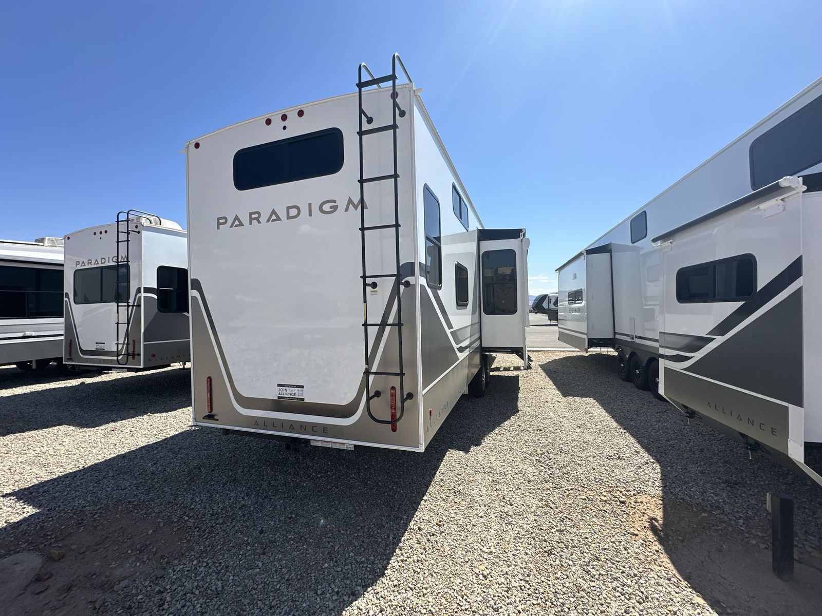 Alliance Paradigm fifth wheel 395DS highlights: Two Full Baths Two Full Bedrooms Loft 19 Cu. Ft Residential Refrigerator Dual Recliner Loveseat King and Queen Beds Fireplace A spacious unit with sleeping for eight with plenty of choices to suit everyone! There is a front private bedroom with aking size bedthat offers a large full front closet that has also been prepped for a washer and dryer if you choose that option. The front bath features a 40" x 30" shower and dual entry. Head down to the kitchen and living space at the bottom of the stairs to find a curbside slide that houses the 19 cu. ft. residential refrigerator, a pantry, and a swivel table and desk. As you continue on toward the rear of this coach, you will find a spacious living area along the roadside with a 50" Smart TV and afireplace, a sofa sleeper slide, and a dual reclining loveseat. This makes a great gathering place for television watching, game playing, and even added sleeping space if needed at night. The rear private bedroom with its own private bath features a queen bed, two closets, and a Smart TV as well. The multipurpose loft area above can be accessed just before this rear bedroom entry by a ladder, and it is perfect for extra storage, or it can be used for added sleeping that the kiddos are sure to love. The Paradigm fifth wheels by Alliance RV are functional, high-quality, and luxurious for an unforgettable camping experience. There are three A/C units and a 40K BTU furnace to keep you comfortable year around, and you'll appreciate additional convenient amenities, like the all-in-one enclosed/heated utility center and the color coded and numbered wiring. AHelux Series coil spring pin box comes standard for hassle-free towing, along with Super-G 4,400 lb. rated tires and Dexter 7,000 lb. axles. You'll love the kitchen with its LG solid surface countertops and Lusso range, plus there is LED motion lighting in the pantry and a Maxx fan with a rain sensor to keep everything fresh when making dinner. Each model also includes an HD Smart TV in the living room and bedroom, plus a Winegard Air 360 antenna to keep you connected to the outside world. And of course there are a variety of options you can choose from to further customize your fifth wheel; dual pane windows, Super Solar Plus, slide out awning toppers, and generator prep or a generator to name a few!