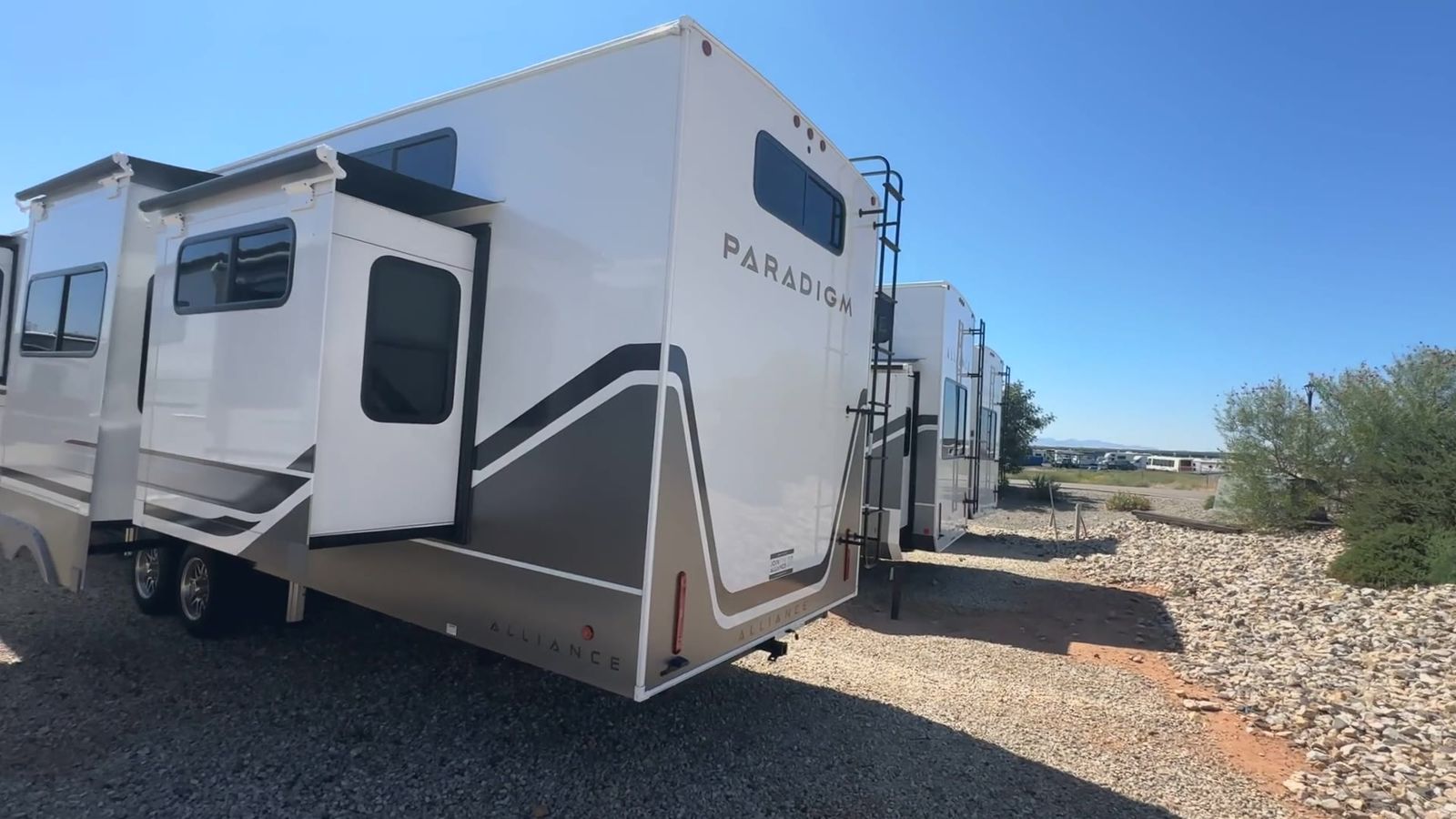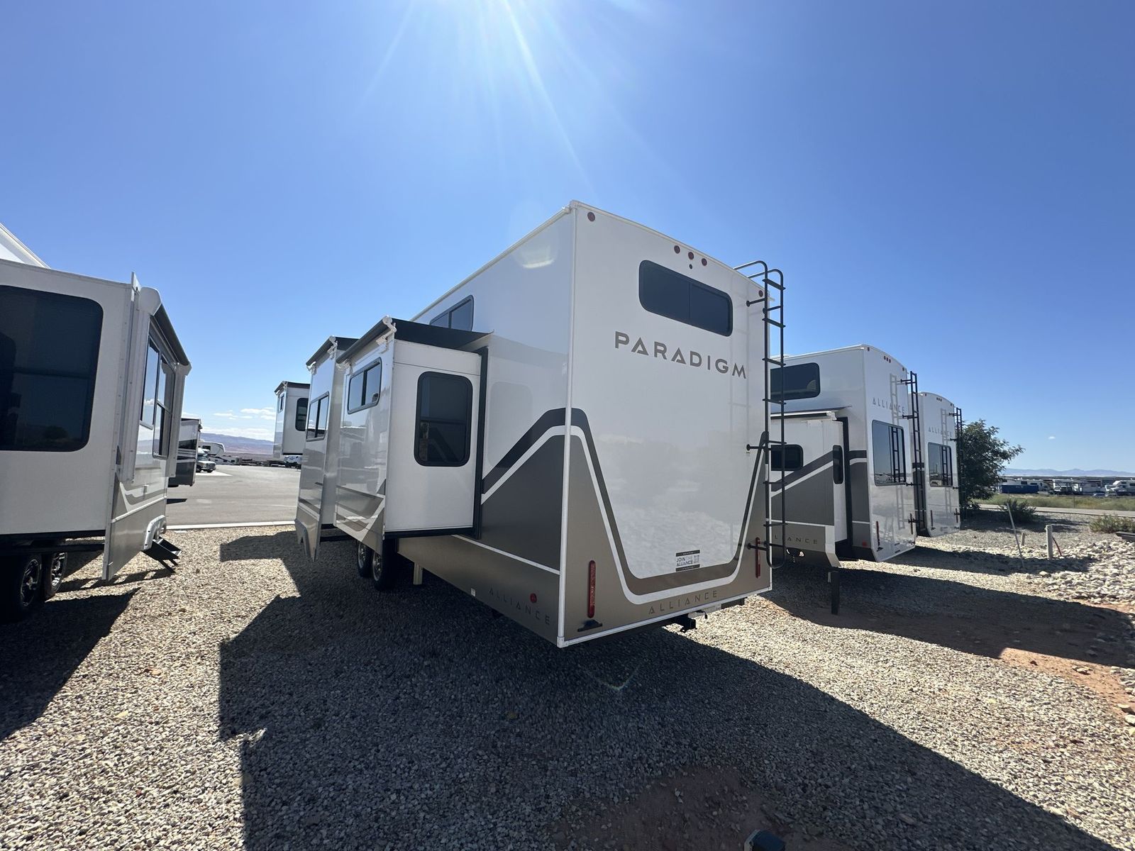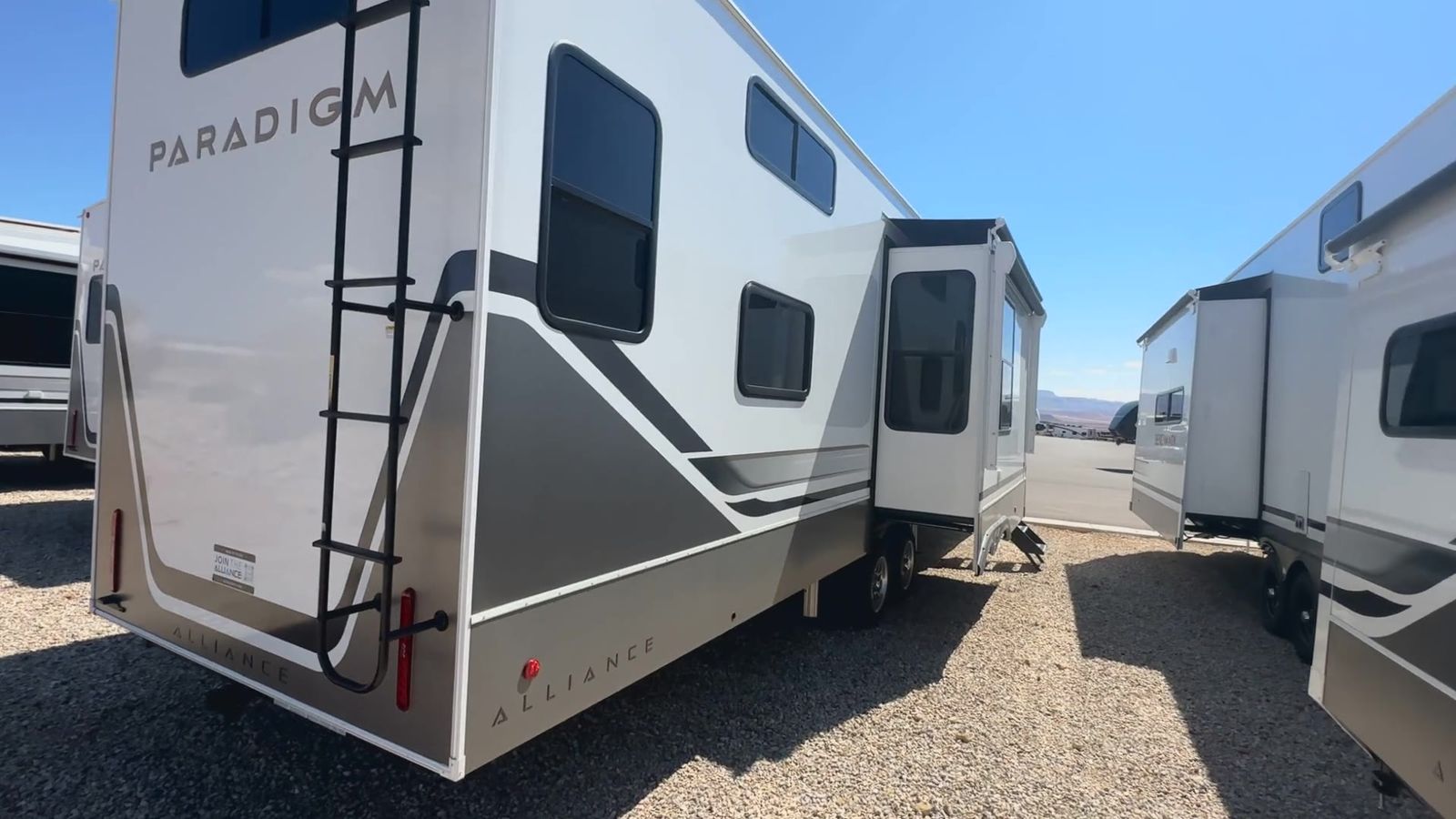 Alliance Paradigm fifth wheel 395DS highlights: Two Full Baths Two Full Bedrooms Loft 19 Cu. Ft Residential Refrigerator Dual Recliner Loveseat King and Queen Beds Fireplace A spacious unit with sleeping for eight with plenty of choices to suit everyone! There is a front private bedroom with aking size bedthat offers a large full front closet that has also been prepped for a washer and dryer if you choose that option. The front bath features a 40" x 30" shower and dual entry. Head down to the kitchen and living space at the bottom of the stairs to find a curbside slide that houses the 19 cu. ft. residential refrigerator, a pantry, and a swivel table and desk. As you continue on toward the rear of this coach, you will find a spacious living area along the roadside with a 50" Smart TV and afireplace, a sofa sleeper slide, and a dual reclining loveseat. This makes a great gathering place for television watching, game playing, and even added sleeping space if needed at night. The rear private bedroom with its own private bath features a queen bed, two closets, and a Smart TV as well. The multipurpose loft area above can be accessed just before this rear bedroom entry by a ladder, and it is perfect for extra storage, or it can be used for added sleeping that the kiddos are sure to love. The Paradigm fifth wheels by Alliance RV are functional, high-quality, and luxurious for an unforgettable camping experience. There are three A/C units and a 40K BTU furnace to keep you comfortable year around, and you'll appreciate additional convenient amenities, like the all-in-one enclosed/heated utility center and the color coded and numbered wiring. AHelux Series coil spring pin box comes standard for hassle-free towing, along with Super-G 4,400 lb. rated tires and Dexter 7,000 lb. axles. You'll love the kitchen with its LG solid surface countertops and Lusso range, plus there is LED motion lighting in the pantry and a Maxx fan with a rain sensor to keep everything fresh when making dinner. Each model also includes an HD Smart TV in the living room and bedroom, plus a Winegard Air 360 antenna to keep you connected to the outside world. And of course there are a variety of options you can choose from to further customize your fifth wheel; dual pane windows, Super Solar Plus, slide out awning toppers, and generator prep or a generator to name a few!