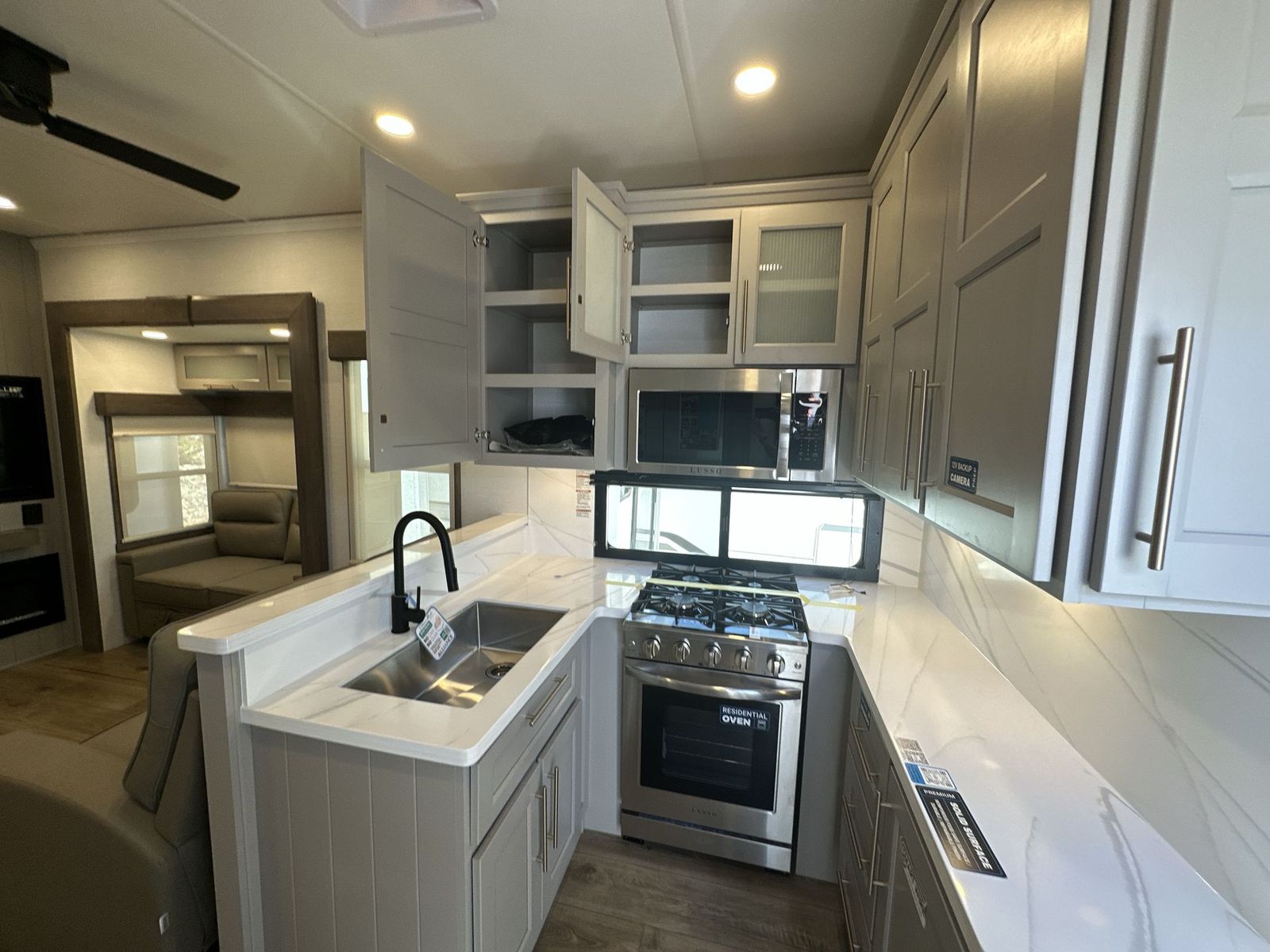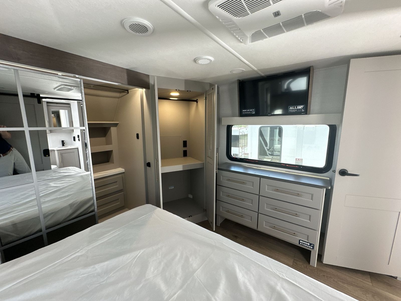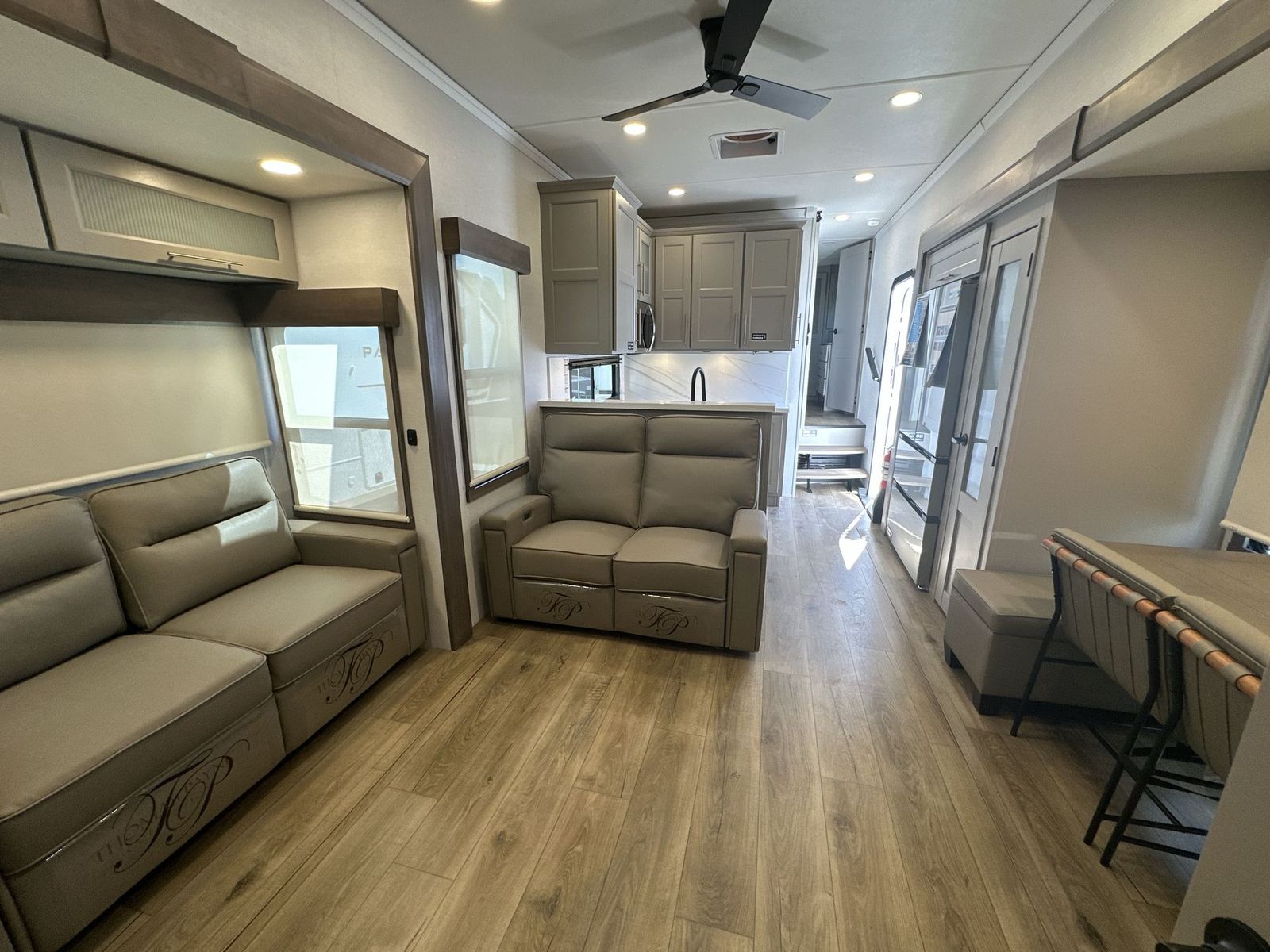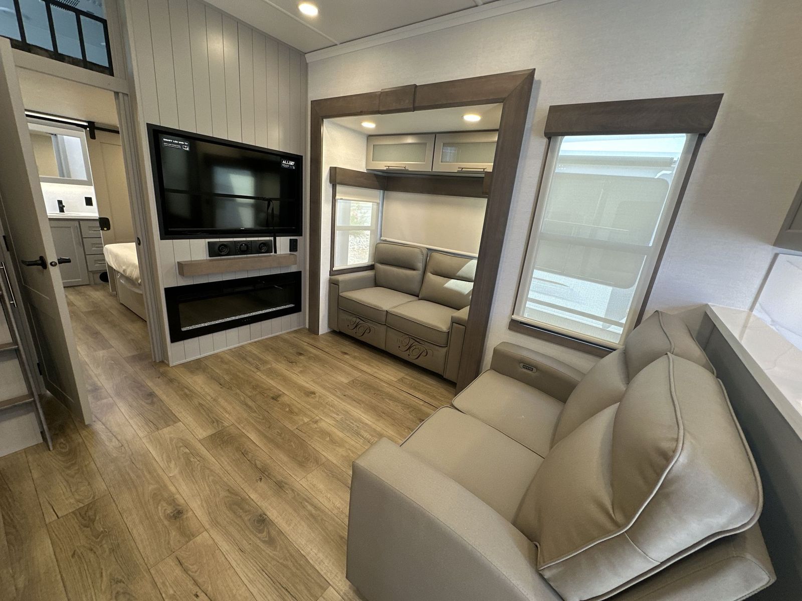 Alliance Paradigm fifth wheel 395DS highlights: Two Full Baths Two Full Bedrooms Loft 19 Cu. Ft Residential Refrigerator Dual Recliner Loveseat King and Queen Beds Fireplace A spacious unit with sleeping for eight with plenty of choices to suit everyone! There is a front private bedroom with aking size bedthat offers a large full front closet that has also been prepped for a washer and dryer if you choose that option. The front bath features a 40" x 30" shower and dual entry. Head down to the kitchen and living space at the bottom of the stairs to find a curbside slide that houses the 19 cu. ft. residential refrigerator, a pantry, and a swivel table and desk. As you continue on toward the rear of this coach, you will find a spacious living area along the roadside with a 50" Smart TV and afireplace, a sofa sleeper slide, and a dual reclining loveseat. This makes a great gathering place for television watching, game playing, and even added sleeping space if needed at night. The rear private bedroom with its own private bath features a queen bed, two closets, and a Smart TV as well. The multipurpose loft area above can be accessed just before this rear bedroom entry by a ladder, and it is perfect for extra storage, or it can be used for added sleeping that the kiddos are sure to love. The Paradigm fifth wheels by Alliance RV are functional, high-quality, and luxurious for an unforgettable camping experience. There are three A/C units and a 40K BTU furnace to keep you comfortable year around, and you'll appreciate additional convenient amenities, like the all-in-one enclosed/heated utility center and the color coded and numbered wiring. AHelux Series coil spring pin box comes standard for hassle-free towing, along with Super-G 4,400 lb. rated tires and Dexter 7,000 lb. axles. You'll love the kitchen with its LG solid surface countertops and Lusso range, plus there is LED motion lighting in the pantry and a Maxx fan with a rain sensor to keep everything fresh when making dinner. Each model also includes an HD Smart TV in the living room and bedroom, plus a Winegard Air 360 antenna to keep you connected to the outside world. And of course there are a variety of options you can choose from to further customize your fifth wheel; dual pane windows, Super Solar Plus, slide out awning toppers, and generator prep or a generator to name a few!