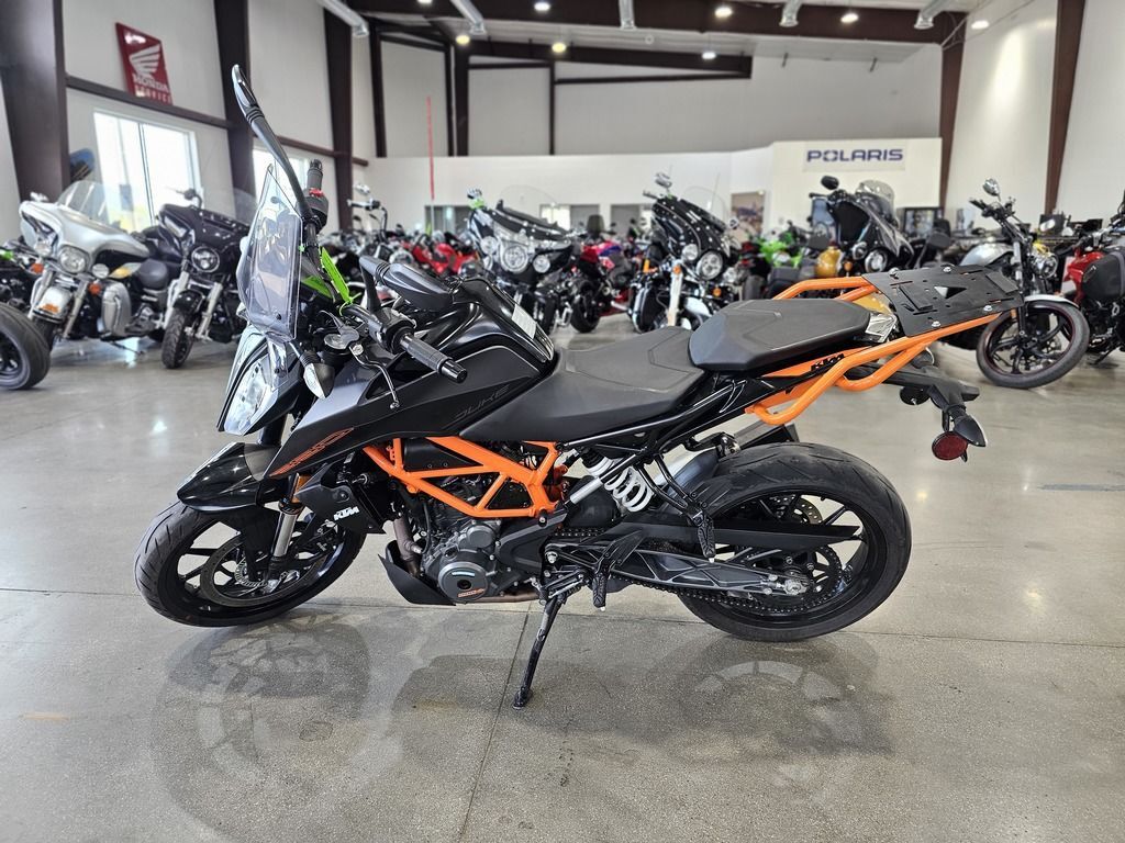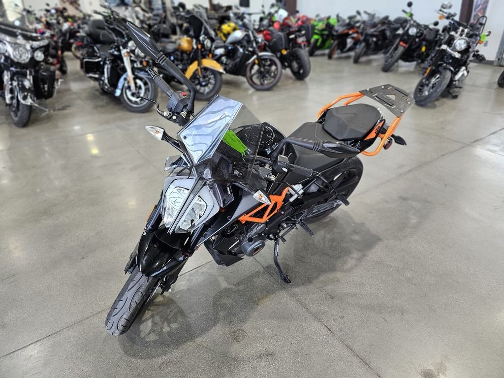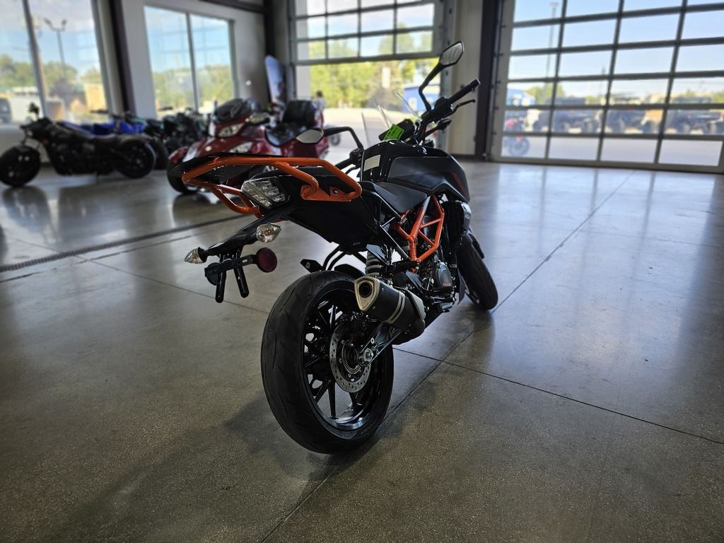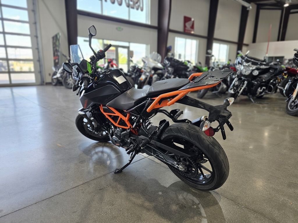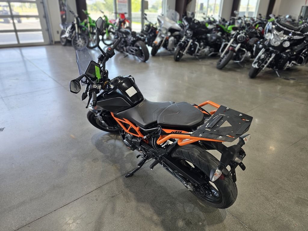2023 KTM 390 Duke THE CORNER ROCKET The KTM 390 DUKE is a pure example of what draws so many to the thrill of street motorcycling. This Corner Rocket maximizes enjoyment and user value, taking the honors wherever nimble handling counts. Light as a feather, powerful and packed with state-of-the-art technology, it guarantees a thrilling ride, whether you're fighting your way through the urban jungle or carving your name into a forest of bends. Features may include: ENGINE & EXHAUST Engine The KTM 390 DUKE engine not only delivers arm-wrenching torque and hair-raising acceleration, but also good manners in everyday use, all with outstanding fuel economy. This lightweight, compact engine really packs a punch and with 32 kW (44 hp) it's one of the most powerful options out there for A2 riders. Thanks to the ingenious intake design and the meticulous fuel injection system, the KTM 390 DUKE is ready and waiting to tear-up the streets and the circuits alike. CHASSIS Suspension The KTM 390 DUKE comes as standard with ultra-lightweight, high-performance upside-down WP forks. Using the latest open-cartridge technology, these forks not only perform above expectations when pushed to the limits, but are also nice and easy to maintain. This makes them perfect for all aspects of riding, from relaxed cruising to hammering around on closed circuits and everything in between. ERGONOMICS & COMFORT Handlebar Hi-tech upright handlebars offer KTM 390 DUKE riders a controlled yet aggressive body position, allowing you to dominate in all aspects of riding. From destroying corners to pulling the perfect stoppie, these bars will give you the balance and confidence you need to attack the road like never before. Clutch and brake levers are fully adjustable, allowing you to customize your cockpit to suit your individual riding style. BODYWORK & GRAPHICS TFT color display As an absolute first in its class, the KTM 390 DUKE boasts an innovative multicolor TFT display, presenting all the data you need to go faster in a clear-cut, uncluttered way. As you rev the engine, the display bars change color, either spurring you on or telling you to back off when the engine’s still cold. The display also automatically adapts its color to best suit the light conditions around you. Innovation at its best!!! SOFTWARE & ELECTRONICS Rider aids The KTM 390 DUKE utilizes market leading technology to enhance your ride and provide you with all the assistance you need to help turn the streets into your own personal playground.