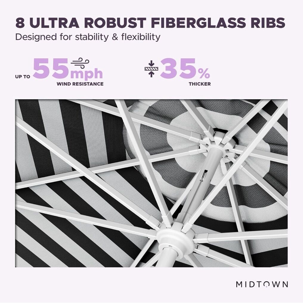 What You Get: 8 Feet White Frame Aluminum Patio Umbrella in Terylast Zebra. This outdoor umbrella can cover a table for 4-6 chairs depending of the shape. This sun umbrella features high quality fiberglass ribs for optimal flexibily against high winds. To avoid defects and replacements, this tilt umbrella is made of a FULL ALUMINUM structure unlike other low end patio umbrellas made of steel and iron. Aluminum is completely RUSTPROOF and is also powder coated for extra protection. What You Need: Auto-Tilt And 360 Degres Swivel For Optimal Shade. Every angle is covered! No more lifting heavy bases to rotate your umbrella with the swivel to rotate feature. Our crank to tilt system is far more superior than the not efficient push button system that often end up breaking after several use. This backyard umbrella is full of feature and has been designed to last. Durability: Kevlar Cord: Built-in unbreakable cord for long lasting use. This deck sun umbrella boasts an incredibly solid opening cord which will keep your crank to tilt system working for the years to come. Intelligent Design: Aluminum Pole: We don’t use rusting iron or steel! This pool umbrella has a thick 2.5mm wall that is rustproof and weather resistant that will provide peace of mind even under rainy weather. Both Terylast or Sunbrella fabrics are waterproof and solution dyed for optimal fade resistance under the beaming sun. Premium Quality: Zinc-Alloy Crank and Tilt: For a seamless opening and closing system. Unlike a ordinary low end patio table umbrella, the crank and tilting component of this umbrella is made from zinc-alloy, a very light, strong and durable metal that will withstand the many opening, closing and tilting.