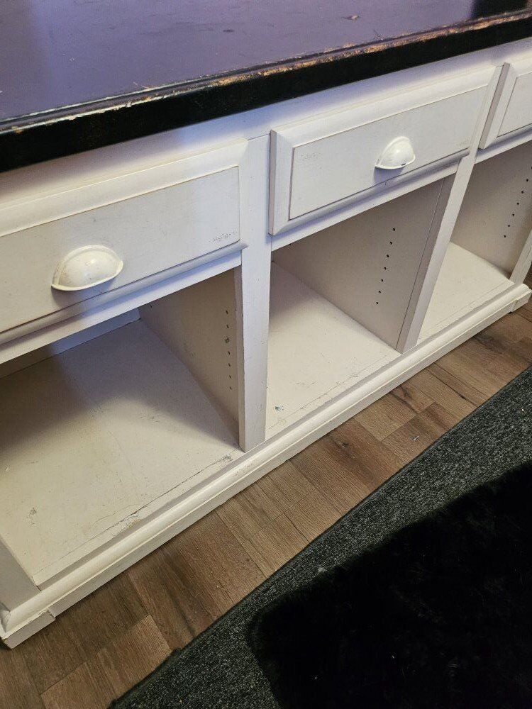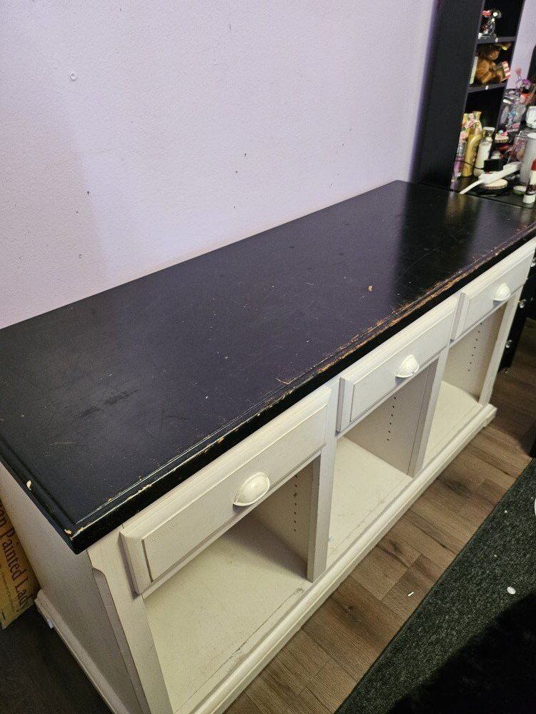 VenmoBeautiful white & black rustic farm house tv stand or could be for an entry way. Whatever you choose this peice will be beautiful in your home. The measurments are in the pics. The top is not scratched its part of the look, this peice can be sanded and refurbished. Has 3 drawers then opens to 3 spots that you can put shelves in. I do not have shelves.