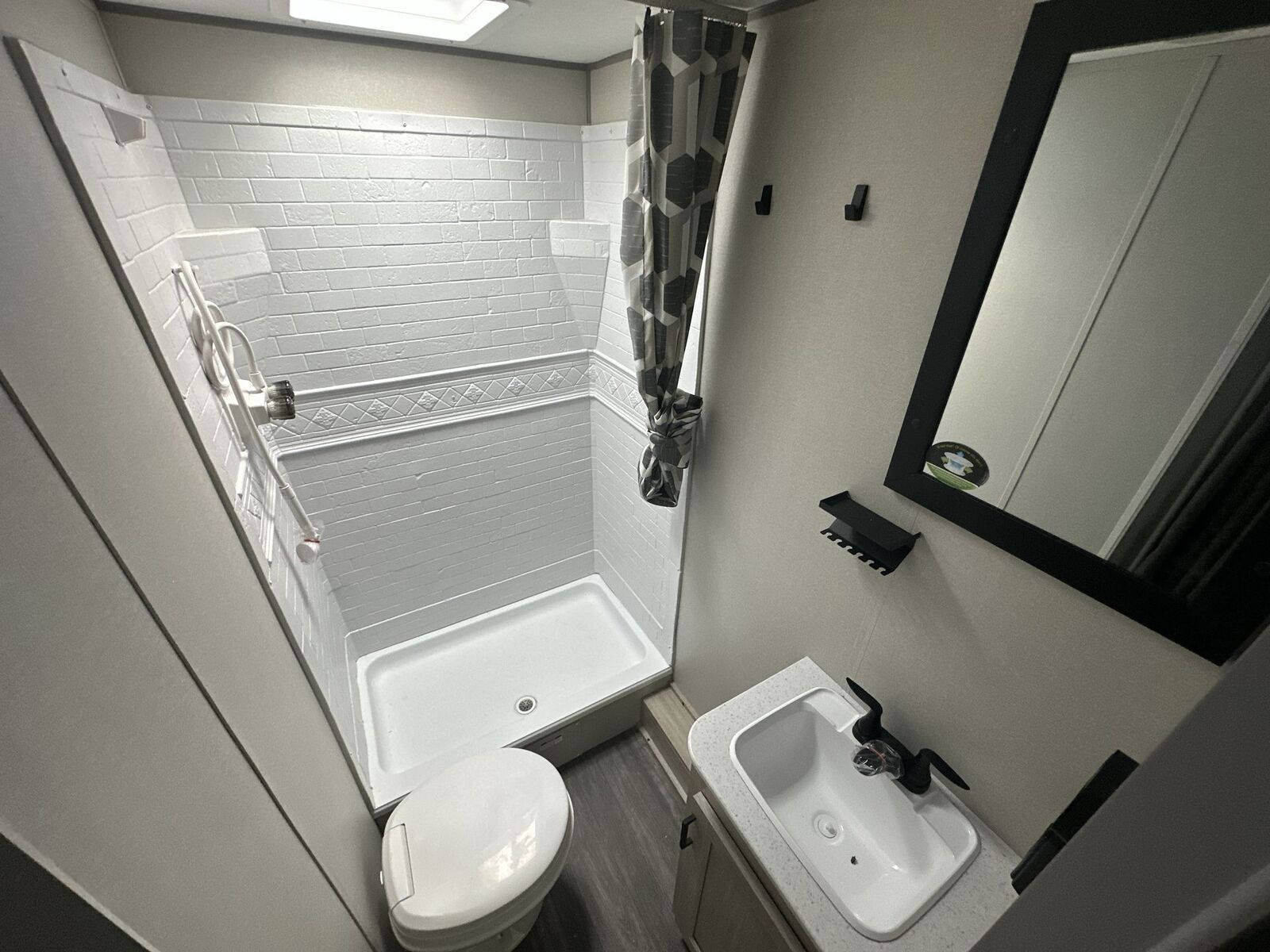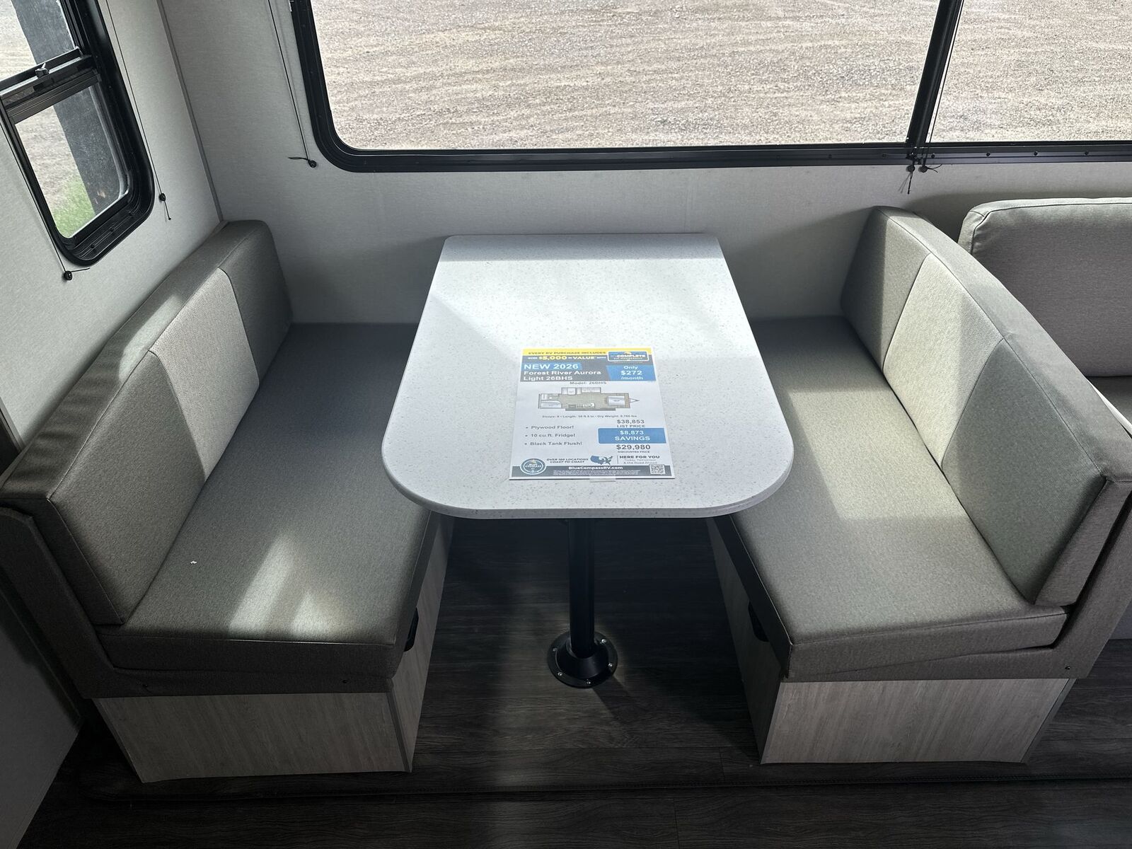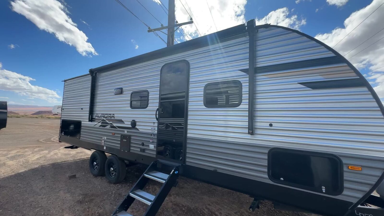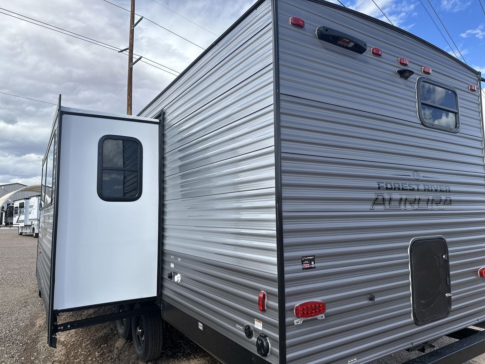 Forest River Aurora Light travel trailer 26BHS highlights: Bunk Beds Queen Bed Booth Dinette Pass-Through Storage Outside Shower Everyone will have a comfortable time camping in this travel trailer! It features a set of double sized bunk beds for the kids or guests to sleep on and are conveniently next to the rear corner bathroom which has a tub/shower with askylight above for added natural lighting. The booth dinette andsofa slide opens up the kitchen area so you have more space to prepare your best meals with the three burner cooktop. When you're ready to wind down your nights, grab a snack from the large pantry, a beverage from the 10.7 cu. ft. refrigerator, and place your drink in the cupholder/arm rest of the sofa while you watch a movie at the entertainment center! Comfortability, usability, and quality is what you will find in each one of these Forest River Aurora Light travel trailers! They are designed with a superior build and packed full with industry leading, functional, and distinctive standard features.The diamond plate rock guard will protect your unit from road debris and the nitrogen filled radial tires, which keep their pressure longer, offer better fuel economy. You will also find upgraded JBL Elite exterior speaker outside, an electric awning with multicolor lights and remote, plus flush mount baggage doors for easy packing. The interiors are beautifully designed with matte black kitchen and bath faucets, black nightshades in the living room, and GE kitchen appliances!