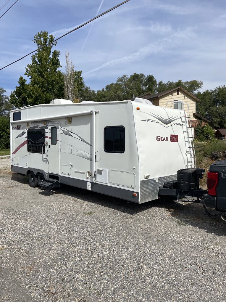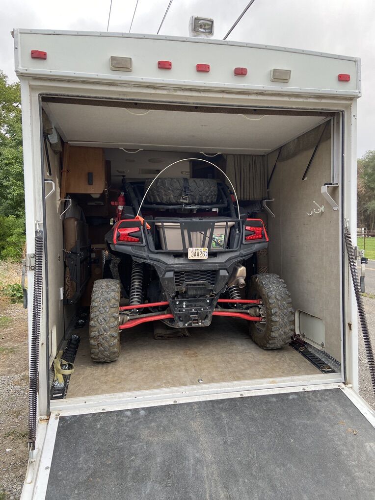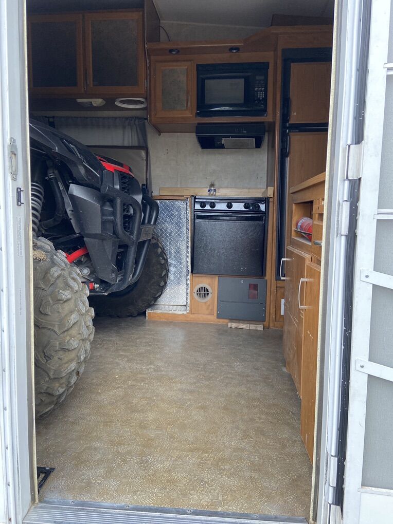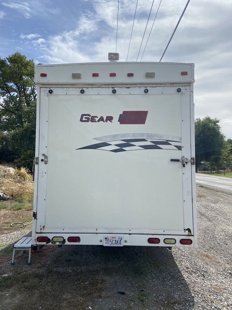 2004 Gear Box toy hauler Model 260 FS Easily fits my KRX1000 SXS with 35 inch tires -96 inches wide wall to wall -85.5” rear door clear height -drop down beaver tail for clearance -84.5” clear height under rear Jack bed -90” clear width opening rear door -83 inches clear width between fold down beds -136 inches length overall to front cabinet -148 inches length at notched cabinet -80 inches wide (no wheel wells) wall to wall -100 gal fresh water tank -40 grey water tank -40 black water tank -hot water heater -All five tires and wheels are new 14 ply load range G ($700) -New brakes all 4 wheels ($1136 brakes and wheel bearings I have receipts feb 2025) -New wheel bearings all 4 wheels -2 near new marine deep cell batteries -awning good condition no rips tears or wear -roof sealed, no leaks -onan 5500 watt generator doesn't run, but turns over, control card verified and tested good by factory, new OEM carburetor (not Chinese junk) -I have new fuel pump but not installed yet -has onboard fuel station for toys and generator -fridge, freezer, hot water tank, oven work good -A/C unit nearly new works great. -Has on board air compressor as well. -There is some wear and tear from the previous owners, but overall everything works. -equalizer hitch and electric tongue Jack -Has a queen bed up front with privacy door -will sleep 6 adults comfortably