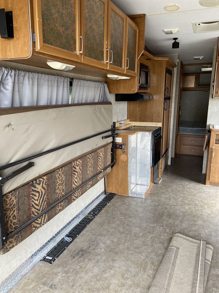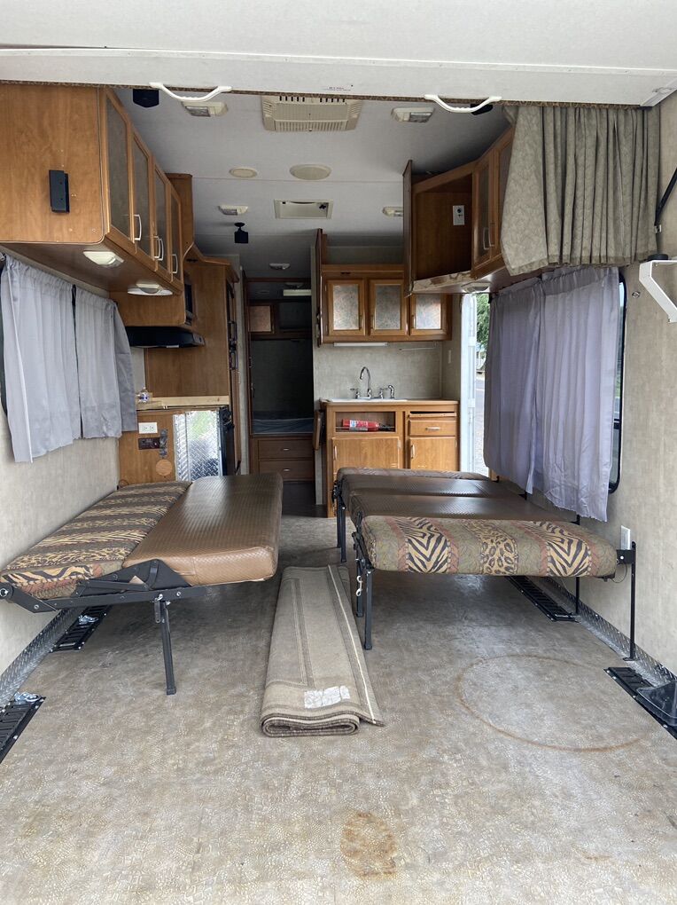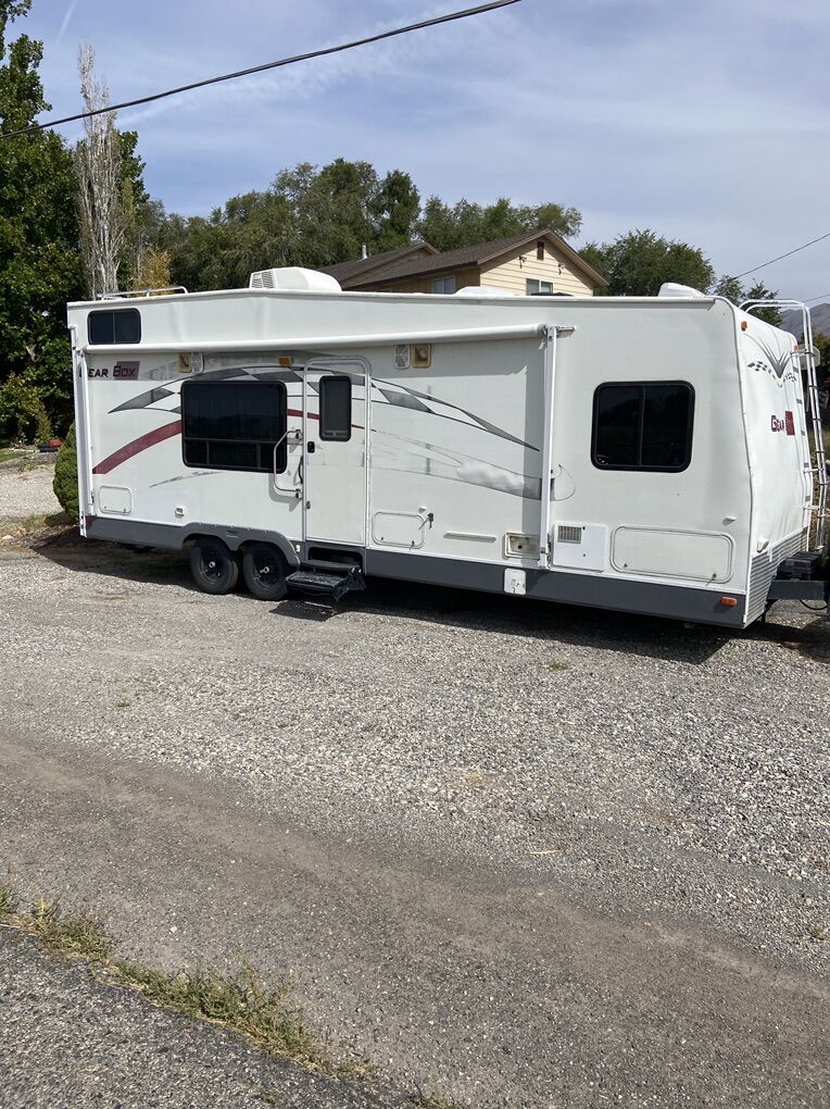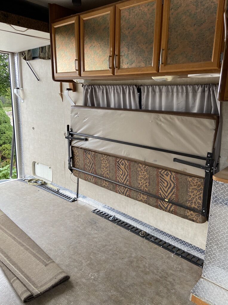 2004 Gear Box toy hauler Model 260 FS Easily fits my KRX1000 SXS with 35 inch tires -96 inches wide wall to wall -85.5” rear door clear height -drop down beaver tail for clearance -84.5” clear height under rear Jack bed -90” clear width opening rear door -83 inches clear width between fold down beds -136 inches length overall to front cabinet -148 inches length at notched cabinet -80 inches wide (no wheel wells) wall to wall -100 gal fresh water tank -40 grey water tank -40 black water tank -hot water heater -All five tires and wheels are new 14 ply load range G ($700) -New brakes all 4 wheels ($1136 brakes and wheel bearings I have receipts feb 2025) -New wheel bearings all 4 wheels -2 near new marine deep cell batteries -awning good condition no rips tears or wear -roof sealed, no leaks -onan 5500 watt generator doesn't run, but turns over, control card verified and tested good by factory, new OEM carburetor (not Chinese junk) -I have new fuel pump but not installed yet -has onboard fuel station for toys and generator -fridge, freezer, hot water tank, oven work good -A/C unit nearly new works great. -Has on board air compressor as well. -There is some wear and tear from the previous owners, but overall everything works. -equalizer hitch and electric tongue Jack -Has a queen bed up front with privacy door -will sleep 6 adults comfortably