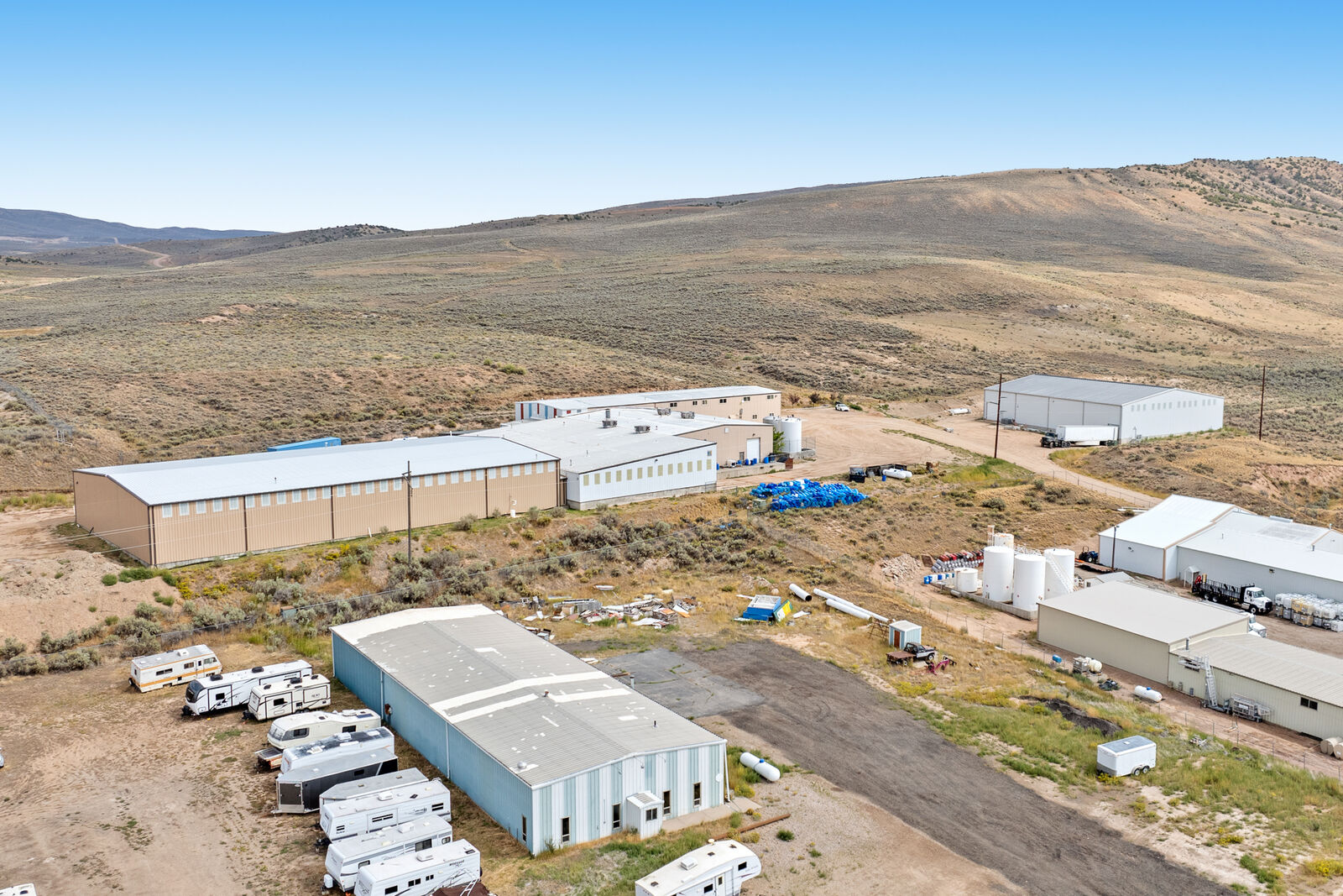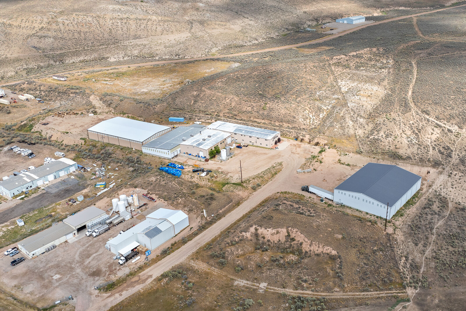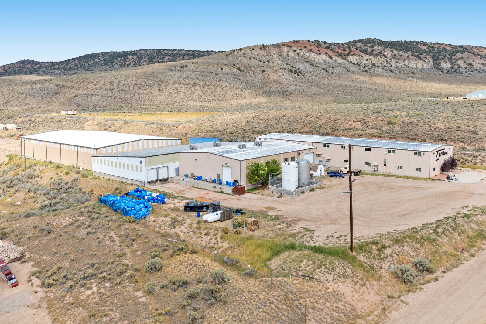 This Evanston, Wyoming manufacturing facility offers 65,674 square feet across two buildings on 5.43 acres. The primary building spans 50,770 square feet, originally built in 1981 with additions built in 2000, 2015, and 2017. It features 22ft warehouse ceilings, multiple loading docks, roll-up doors, office areas, break rooms, showers, lab space, and packaging rooms.
