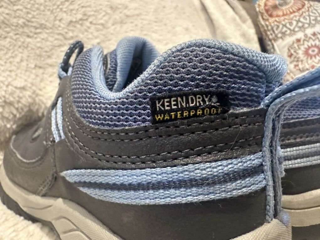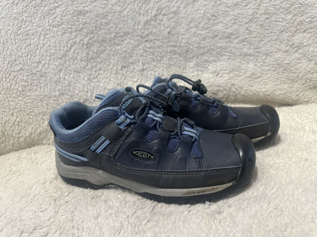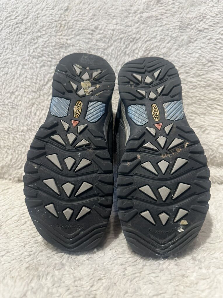 Keen youth size 3 gray with blue trim, waterproof, hiking shoes with elastic laces and a toggle at the top. These are in good condition, other than some of the fabric has worn off on the corners against the top of the tongue. See photos for details. I take cash or Venmo, but cash is preferred. Text is best. 801-201-4446. Check out my other ads for additional sizes and styles.