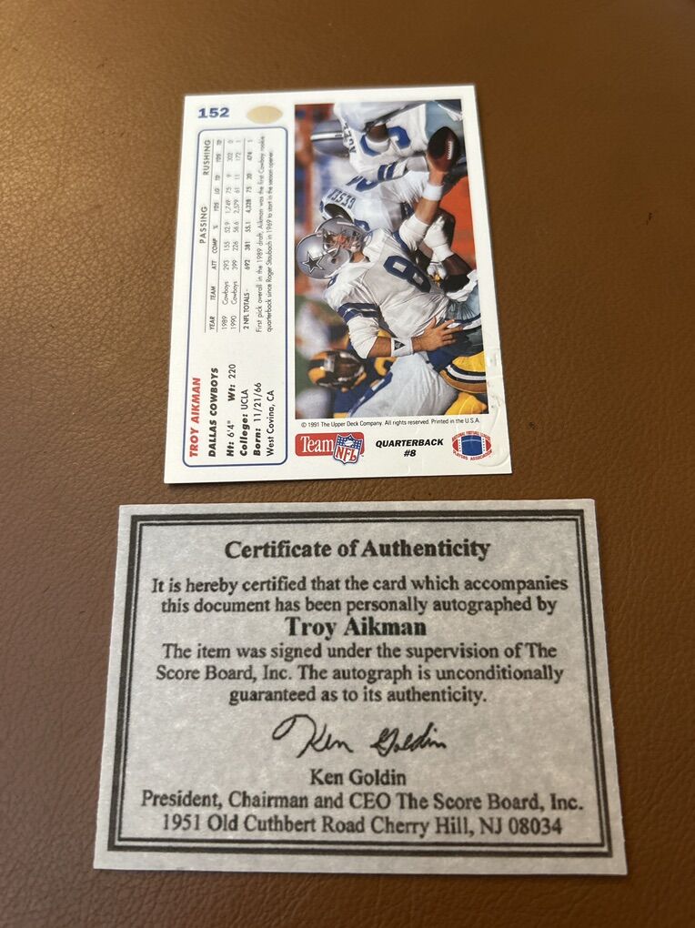 PayPalTroy Aikman Dallas Cowboys Autograph Hand Signed Football Card with Embossed Score Board stamp