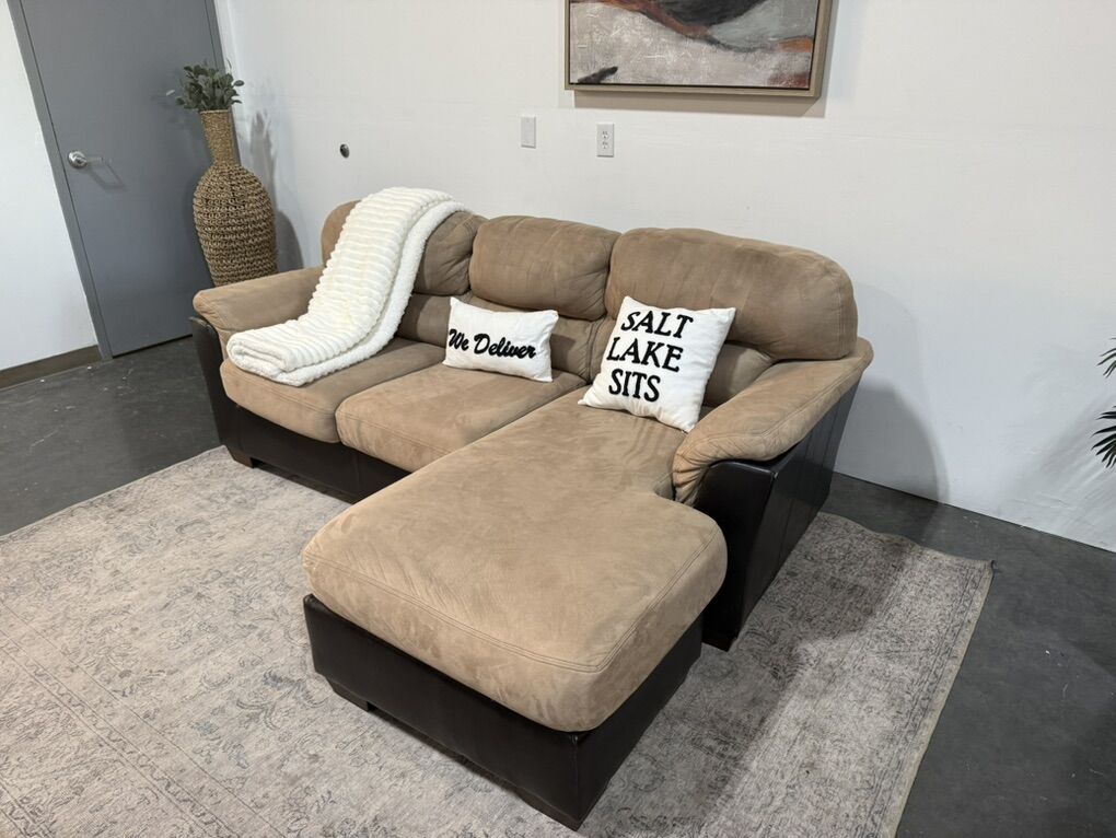 Follow Us On Instagram: SaltLakeSits Retail Price: $1600 Your Price: $499 ️ Tan microfiber sectional with dark faux leather base. Features wide padded arms, a right-side chaise, and plush cushions for comfort. A practical and inviting piece that works well in both casual and family-friendly spaces. 🫧 Expertly Cleaned 🫧 Dimensions: 85” x 60”