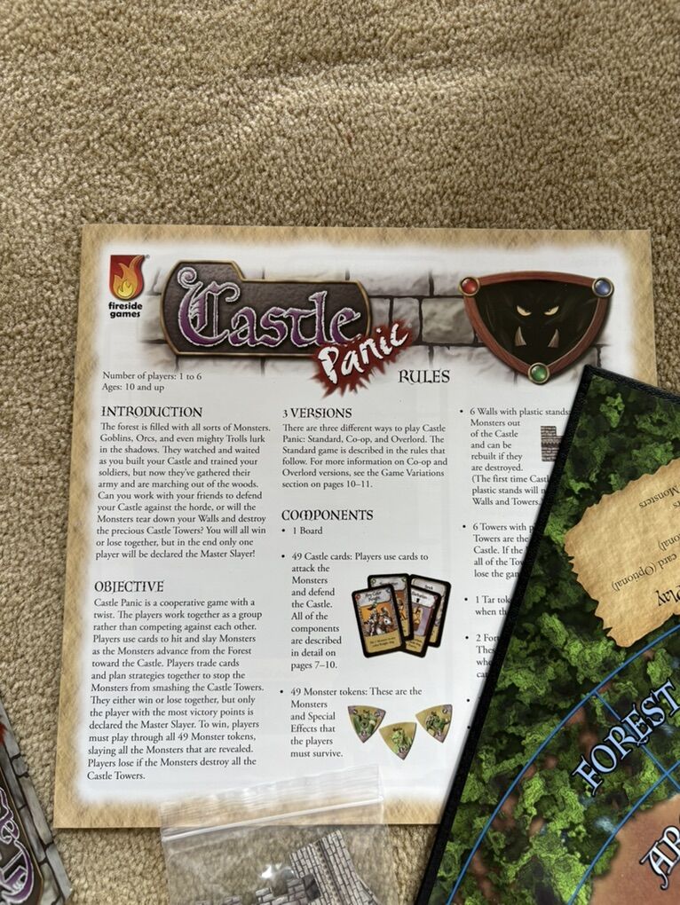 COMPLETE Castle Panic: A cooperative tower defense game. Defend the castle. Survive the panic. Become the master slayer! Award-winning game by Fireside Games, Justin De Witt, 2010. 1-6 players, age 10+. Complete, no missing pieces. Excellent condition. Text only. Cash or Venmo.
