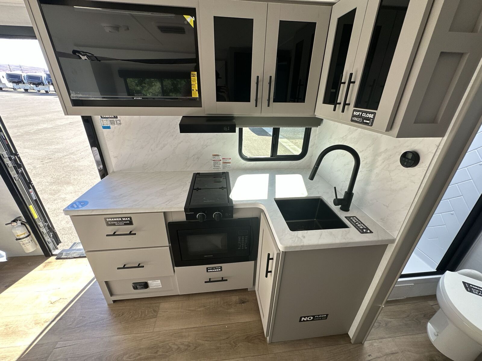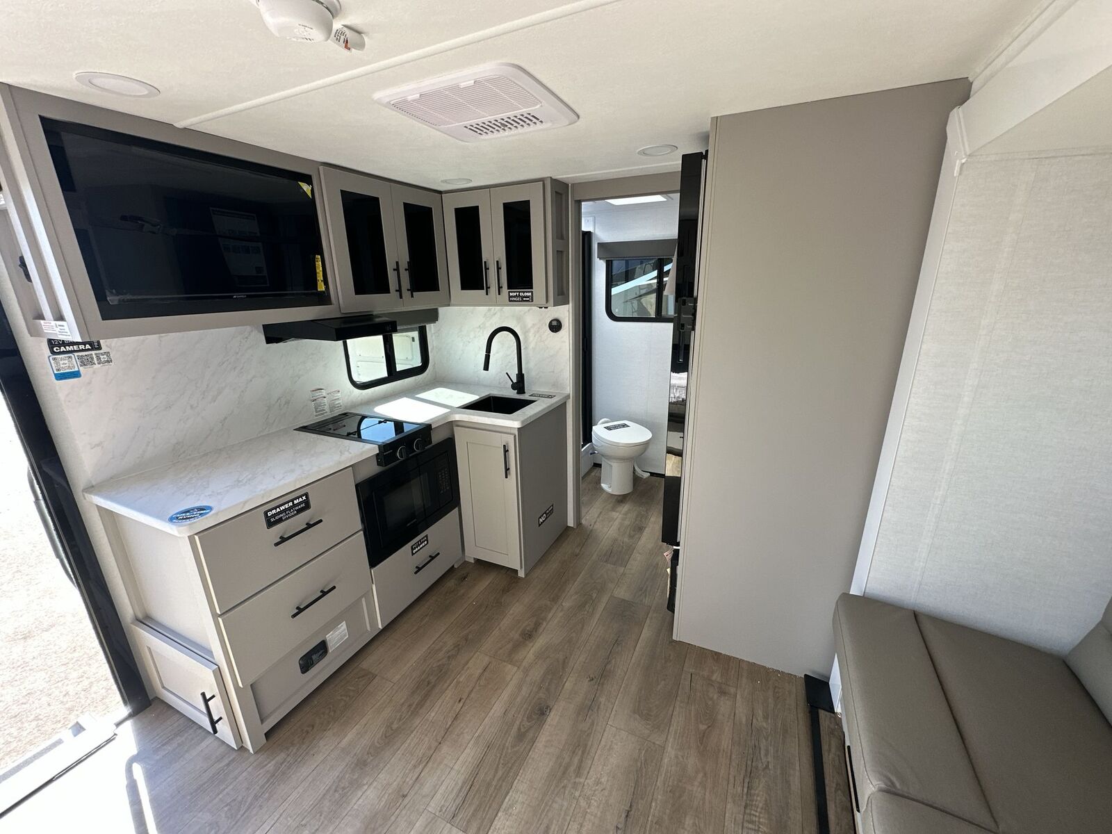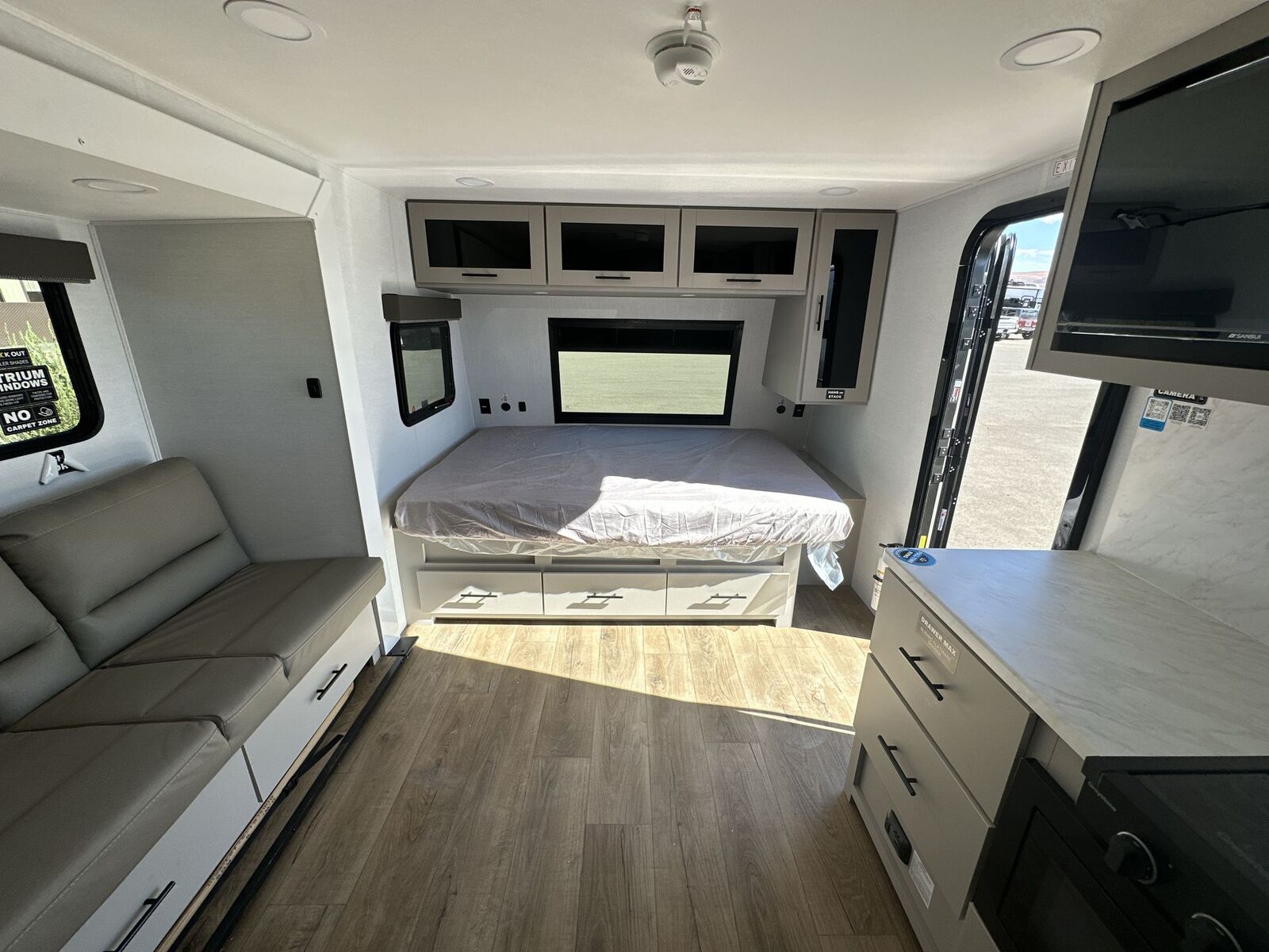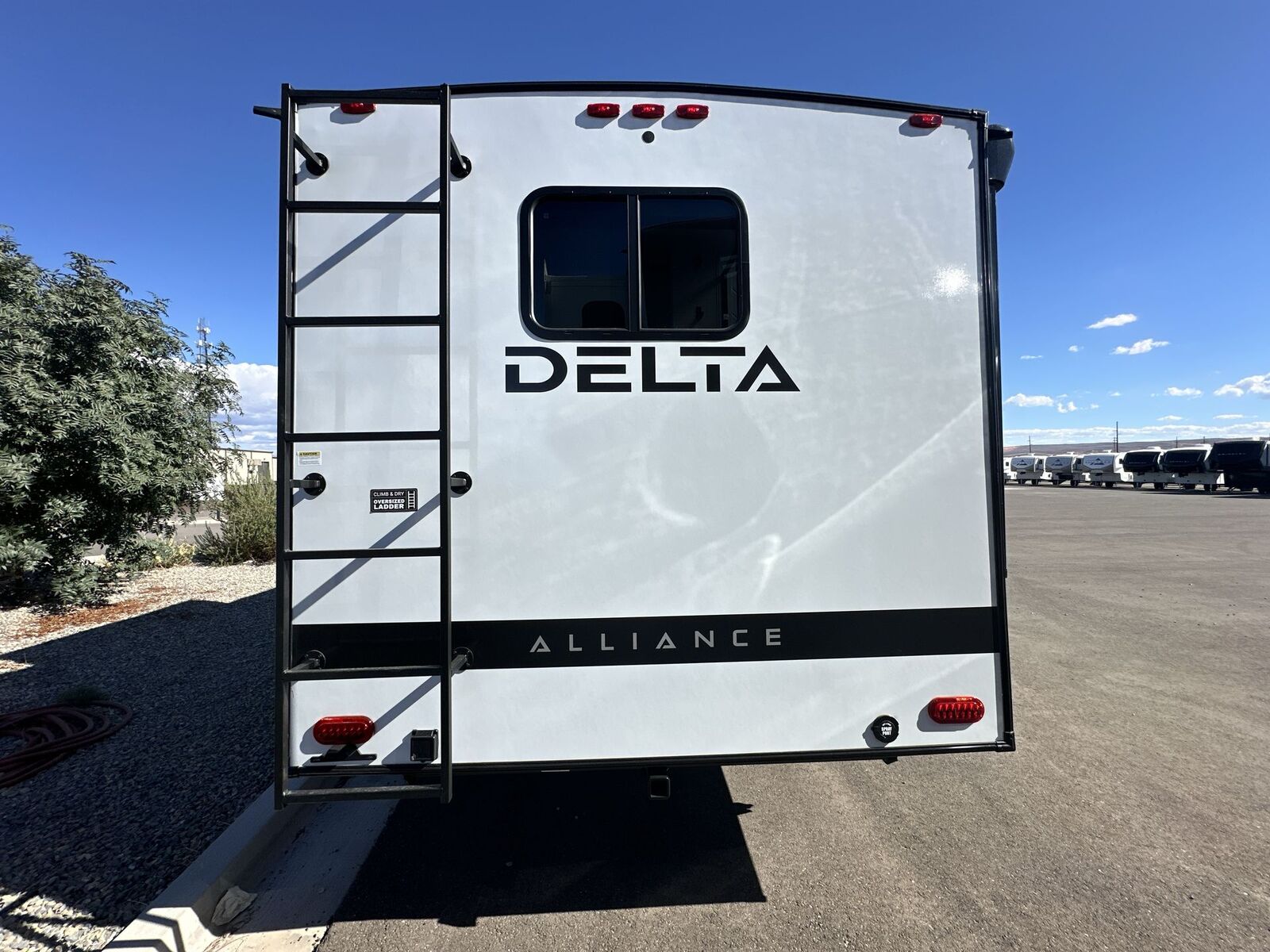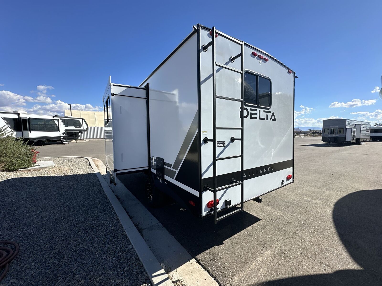 Alliance RV Delta Solo travel trailer ML166 highlights: Overhead Storage 13" Awning Sofa In Slide Out Queen Bed Enter this thoughtfully designed trailer through the 28" entry and step into a space that blends comfort and functionality. At the front, a 60" x 80" queen bed offers restful sleep, complete with a wardrobe at the foot and overhead storage. The center features an L-shaped kitchen equipped with a sink, 2-burner cooktop, overhead cabinets, and a 32-inch TV, while directly across, a 10-cu. ft. refrigerator and a slide out with a 60" jackknife sofa maximize space and convenience. At the rear, enjoy a full bathroom with a 30" x 36" shower, toilet, sink, linen shelves, and additional overhead storage making this compact trailer feel like home wherever you go. Each Delta Solo model is designed to deliver both comfort and convenience in a compact footprint. Inside, you'll find residential-style touches like can-style LED ceiling lights, durable cabinet doors with magnetic catches, and commercial-grade vinyl flooring built to last. On the exterior, practical travel features include easy-access switches for the slide-out and awning, sturdy Step Above fold-out entry steps, and color-coded, numbered wiring for simplified maintenance and troubleshooting.