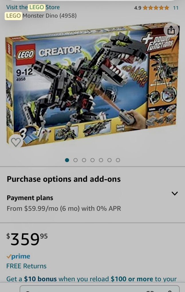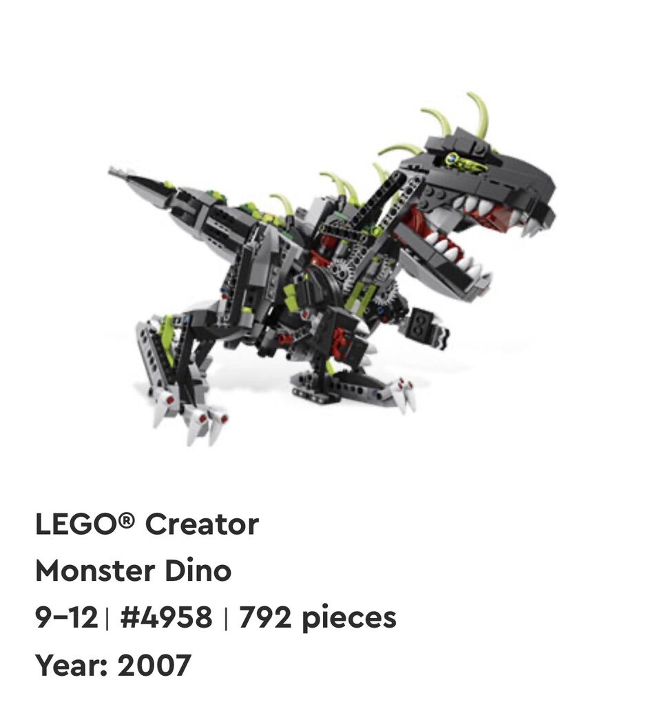 Get ready for a prehistoric adventure with the LEGO CREATOR Monster Dino set (4958). The LEGO Monster Dino set is a complete set with electronic features that make it perfect for imaginative play. Features: This 3-in-1 set allows building a Monster Dino, a walking spider, or a crawling crocodile. It includes Power Functions elements for movement and sound, such as a roaring sound brick, motor, remote control, and receiver. Pieces and Age: The set contains 792 pieces and is recommended for ages 9-12.