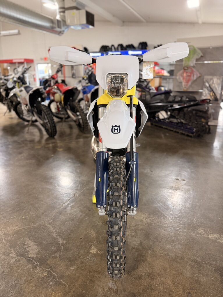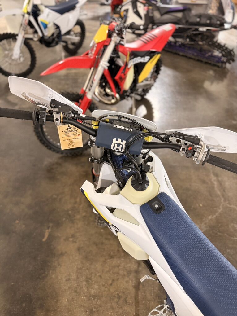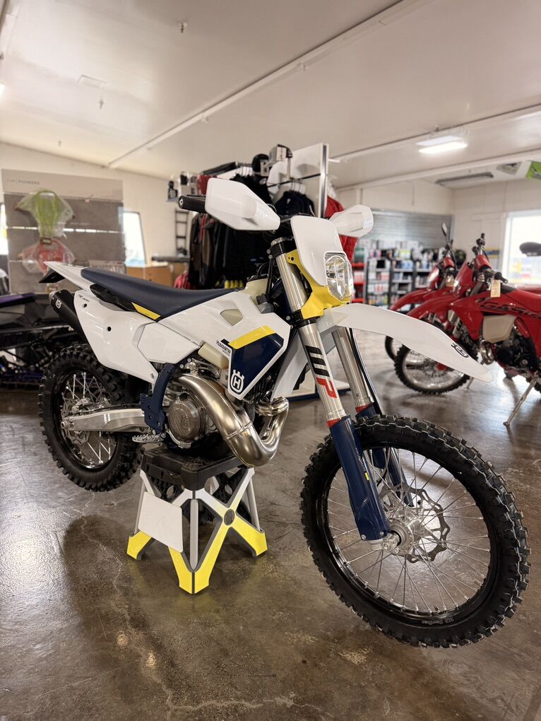 300cc two stroke engine Fuel and oil injected, no more mixing gas LED headlight and taillight 6 speed transmission Electric start WP Xact suspension Pro Taper handlebar 2.28 gallon fuel tank 239 lbs dry weight