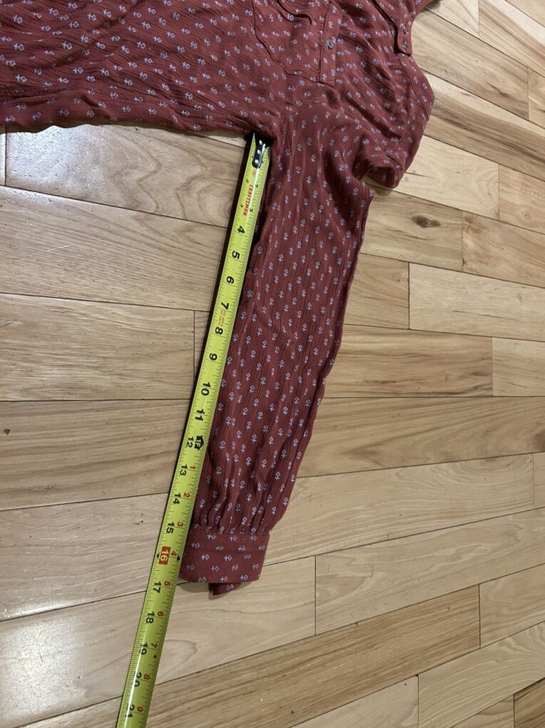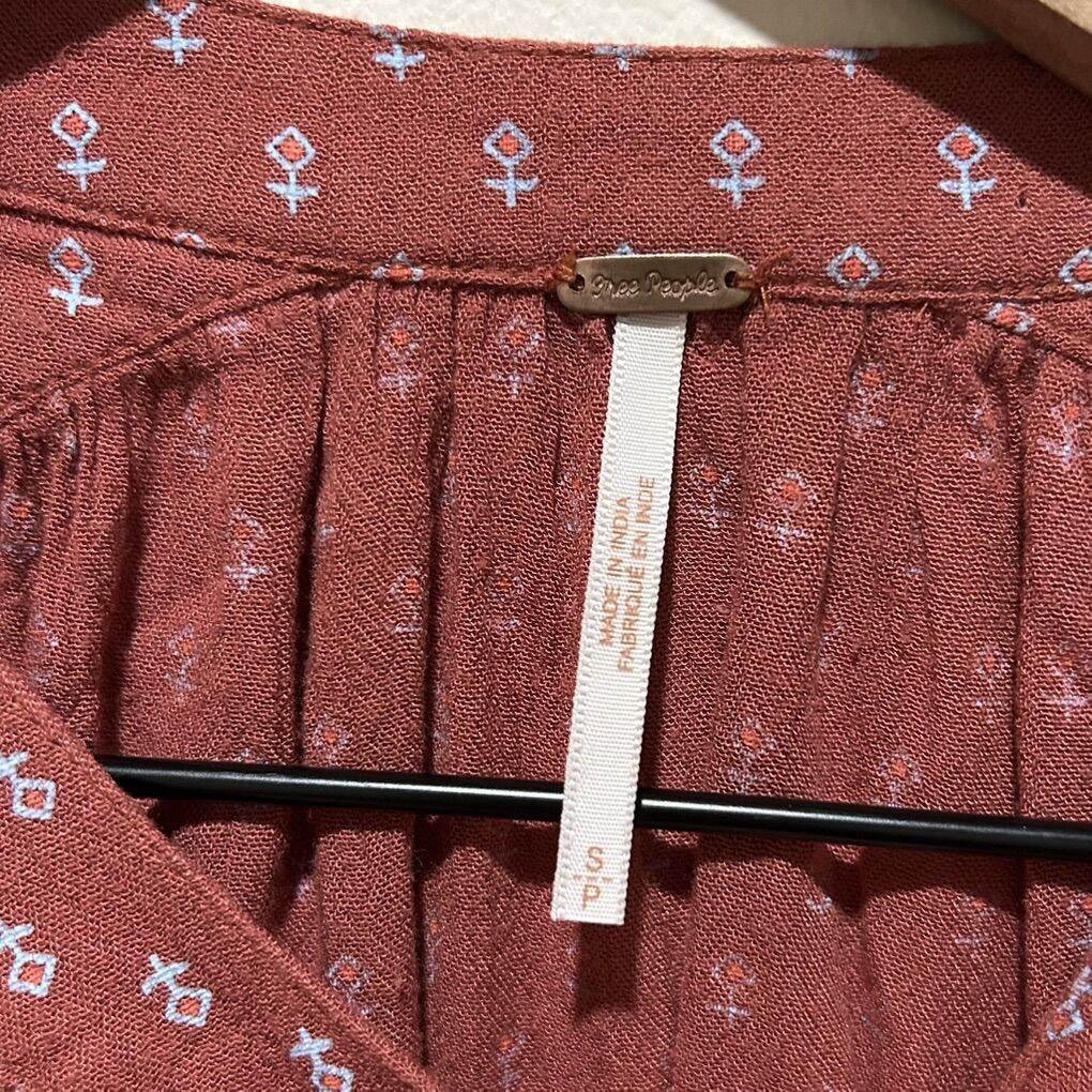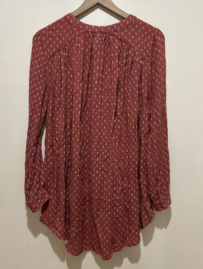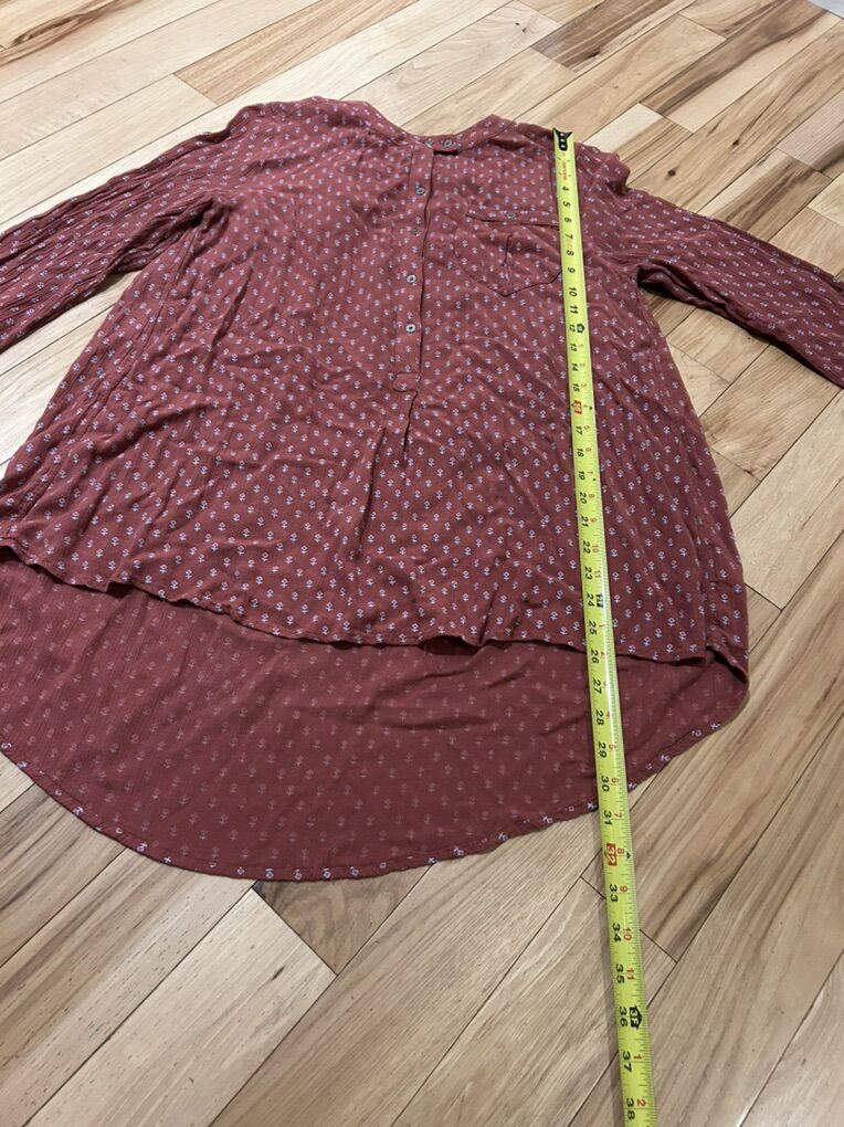 Free People Copper Rust Orange Brown Printed Long Sleeved High Low Oversized Half Button Tunic Blouse Top - Women’s Size Small - great condition - pre-owned. D046