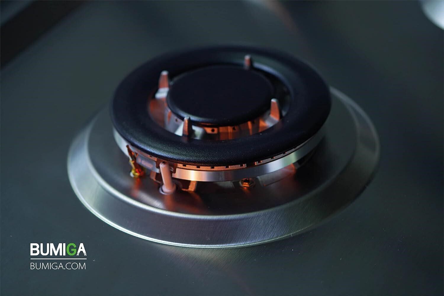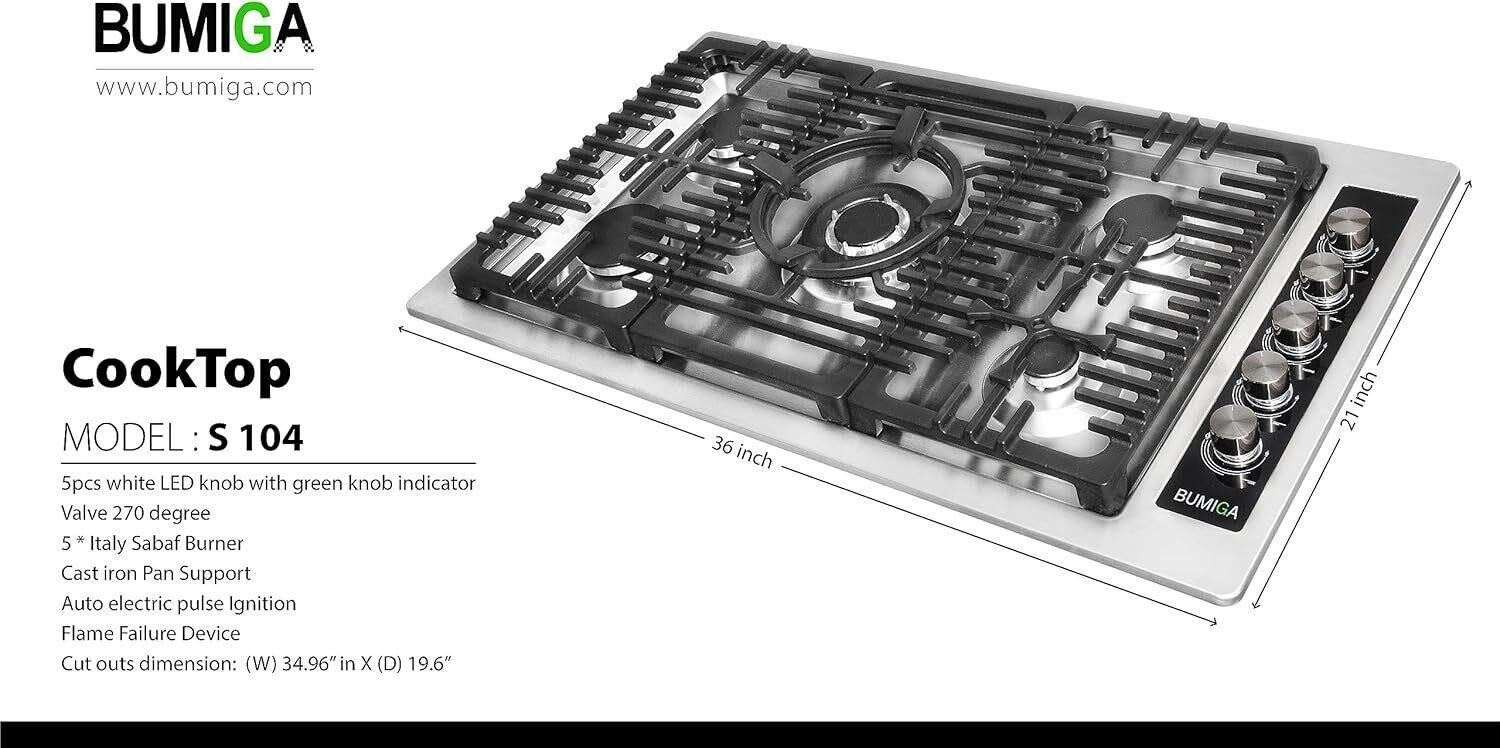 KNOBS & VALVES: 270 degree valves with 5pc pearl black and white LED knobs with green knobs indicator on top of tempered glass stripe that lays on top of stainless steel. Knobs comes with a blinking (warning) system to indicate that the off burner is still hot! BURNER & CAST IRON: Italy SABAF made 5 burners with diverse thermal power. 12,000 BTU burner, 10, 200 BTU burner, two 6000 BTU burner, 3,400 BTU burner. Professional engineering heavy duty cast iron grates design SAFETY & DESIGN: It has flame failure device and includes ignition with auto electric pulse. A modern day design by U.S engineers with an integration of glass & stainless steel which gives it a unique appearance. ACCESSORIES & QUALITY: Made with high quality stainless steel panel and black tempered glass. In addition it comes with, 1pc cast iron round pot rack and 1pc cast iron cross pot rack, 1pc gas fitting, regulator and LPG conversion kit as accessories. SUPPORTING: Product dimensions (W) 36 in X (D) 21 in X (H) 4.6 in and cut outs (W) 34.96 in X (D) 19.6 in/net weight is 48.80 lb.