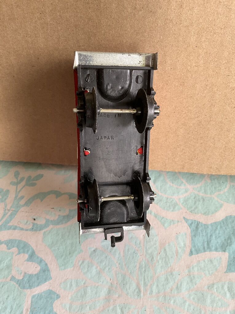 Toy metal-top railroad car “ Made in Japan”. Looks like 1960’s; as an inexpensive toy. About 4” long. Use for display.