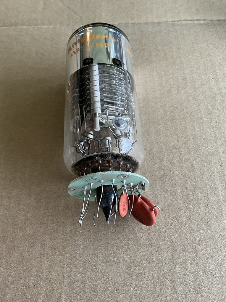 Amperex AVB201/452(3?) photomultiplier or vidicon electron tube. Makes a very interesting display artifact. If you’re into vacuum tubes this is a unique piece. Obviously it’s used; have no way to verify good or bad function.