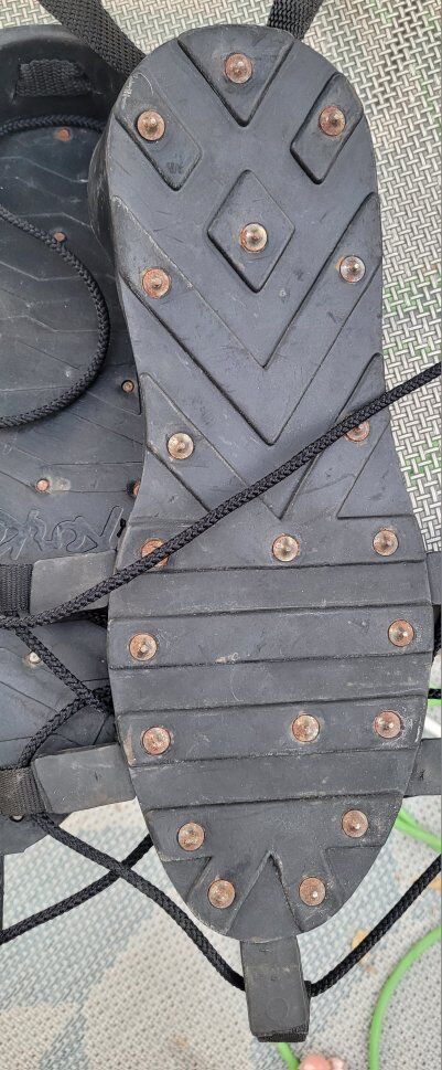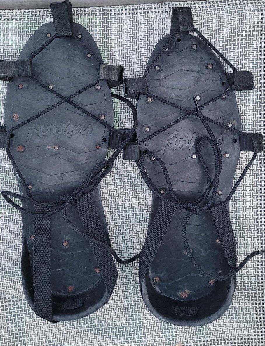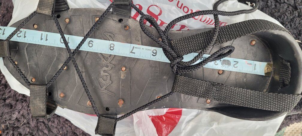 The Vintage Korkers Spike Sole Ice Cleat Overshoes are a unique and practical choice for outdoor activities such as fishing, hiking, roofing and logging. With a classic black color and a spike cleat design, these overshoes provide extra traction and stability on icy or snowy surfaces. Made with synthetic upper material, they are durable and designed for long- lasting use. Perfect for those looking for a reliable and stylish option for their winter adventures. From the inside heel to the toe is 13 inches. Make sure your shoe is no longer than 13 inches.