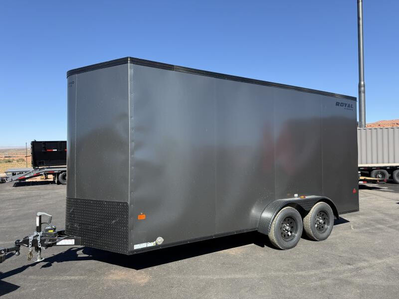 Trailer Specs: Color: Charcoal .030 Bonded Aluminum Interior/Bed: Length: 16' Box + V-Nose Width: 6'8" Height: 7'0" Door/Ramp: Rear Spring Assist Ramp Door (Width: 72" x Height: 80") Weight: 2,465 lbs. | GVWR: 7,716 lbs. | Payload: 5,251 lbs.