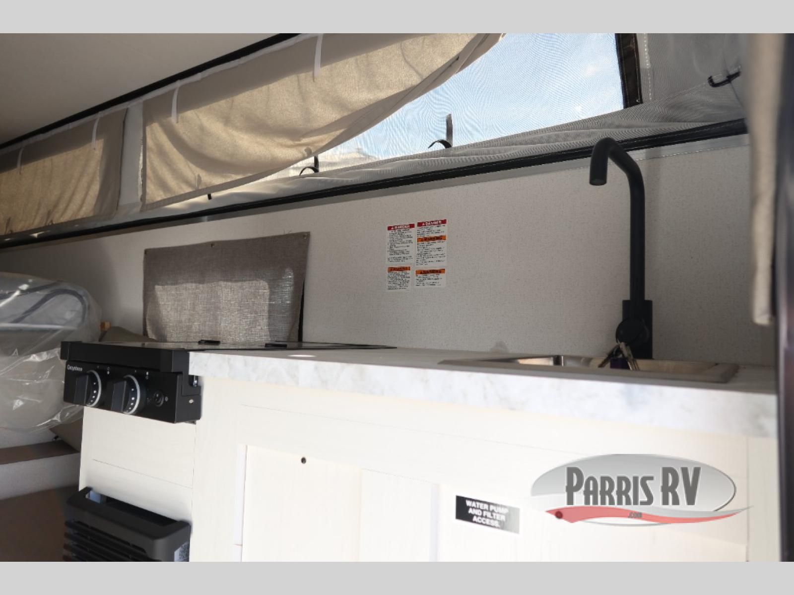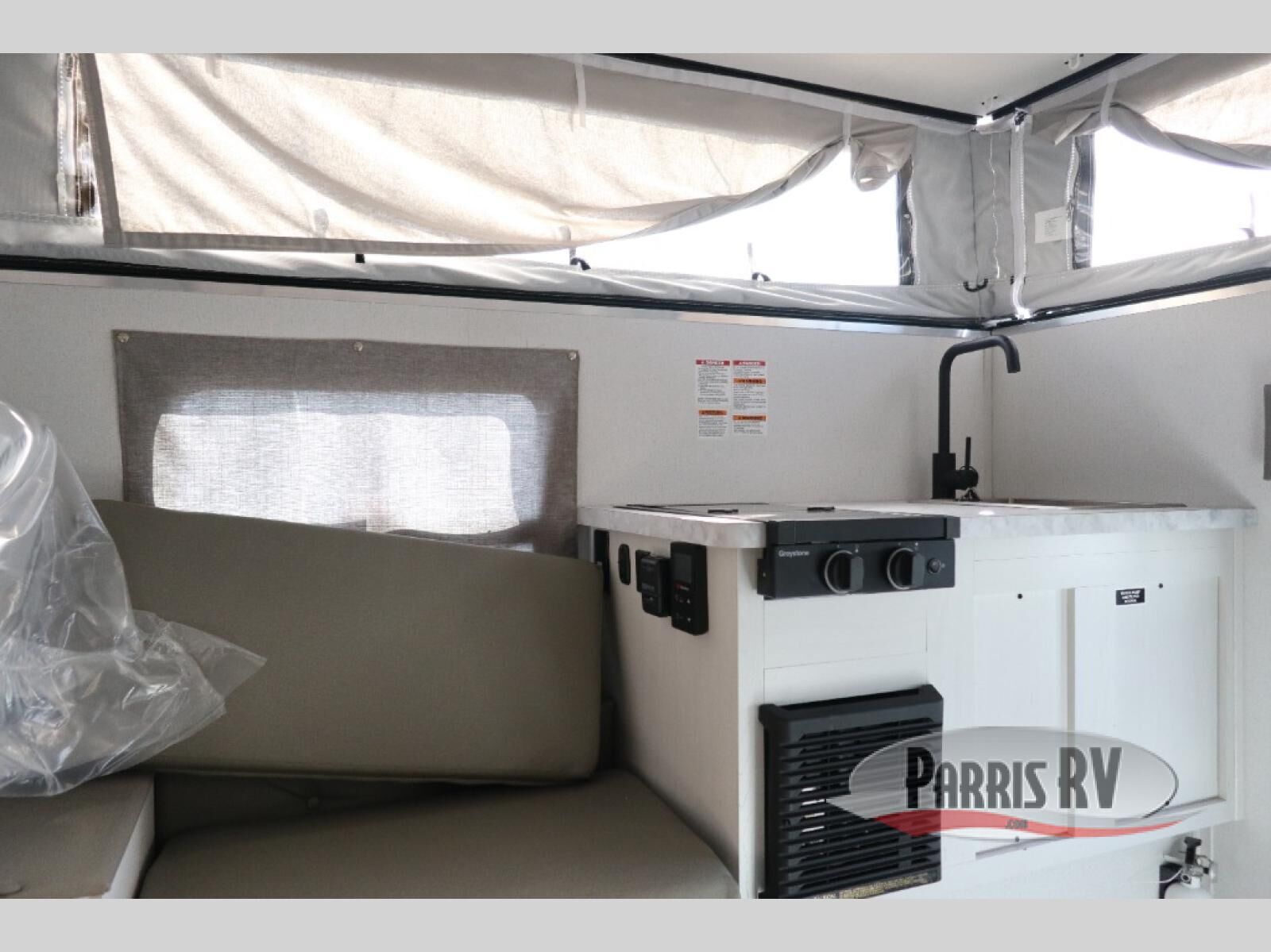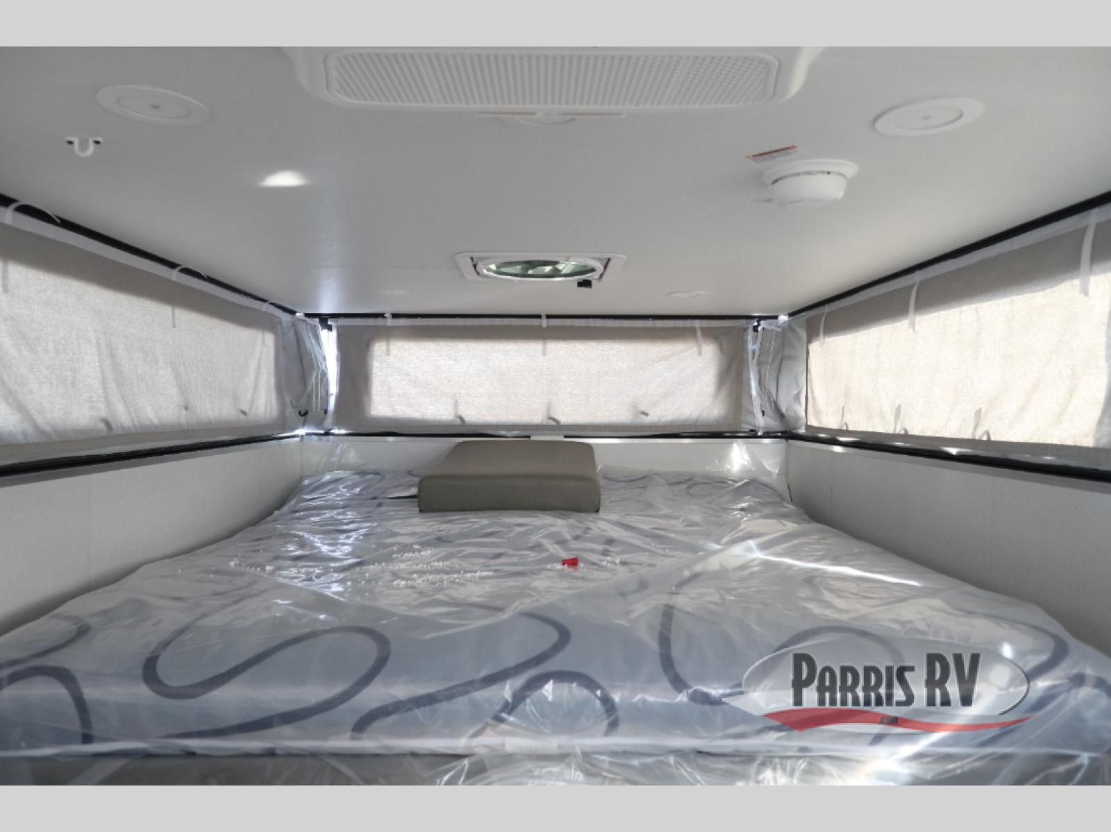 If you're in need of a soft side truck camper designed for a compact truck then look no further! The front queen bed helps you get a good night's rest so you can be ready for your early morning fishing trips. You can also fry the catch of the day on the two burner cooktop and enjoy it at the U-shaped seating area with a table. If there happens to be any leftovers then you can store them in the refrigerator, and the storage area next to the refrigerator helps to keep your items out of the way.