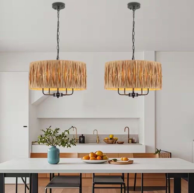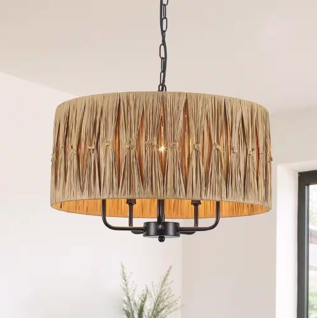 ApplePay19" 5-Light Black Bohemian Raffia Dimmable Chandelier with Hand-Woven Drum Shade for Kitchen Dining Room Entryway
