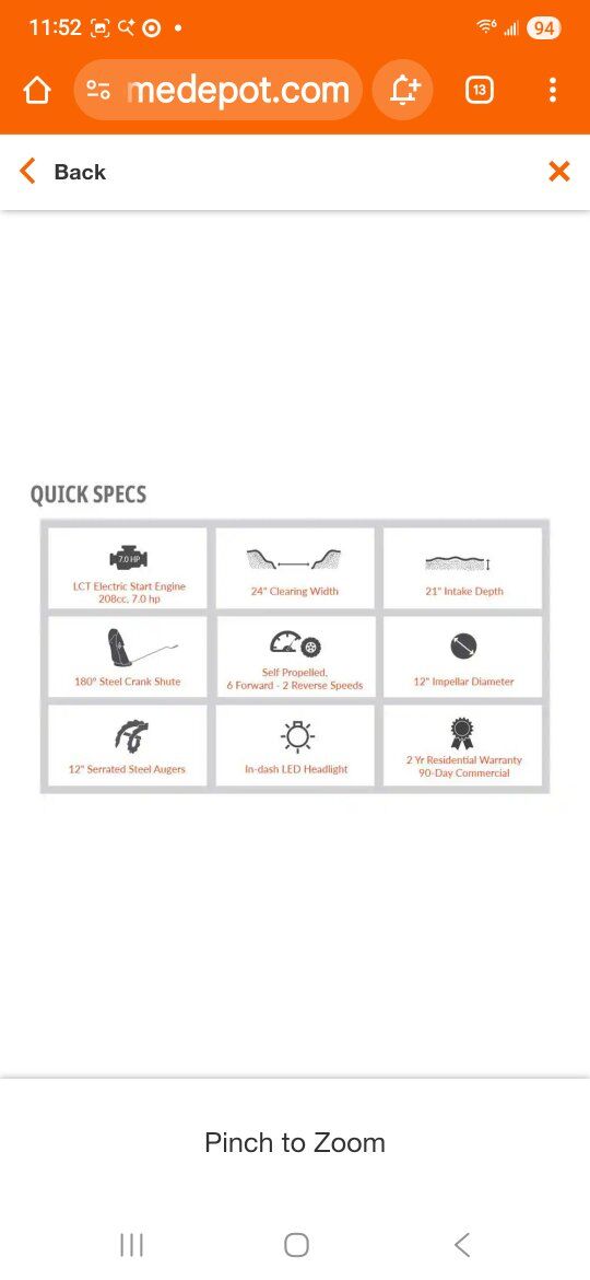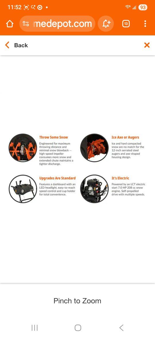 Engine LCT electric start, 7.0 HP 208 cc snow engine Push-button electric start with recoil backup for reliable ignition in any condition Multi-speed (6 forward and 2 reverse) self-propelled drive delivers max speed and control Serrated steel augers easily slice through packed ice and snow