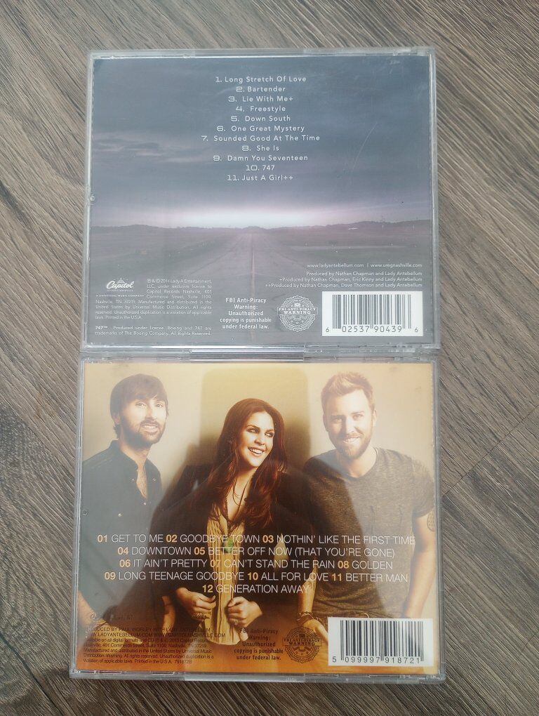 VenmoI have 2 Lady Antebellum CDs. Golden and 757 albums. I also have the Christmas album. [not pictured] In good condition- they both play great. Just going through my CDs. $5 each. Cash or Venmo. From a smoke-free home.