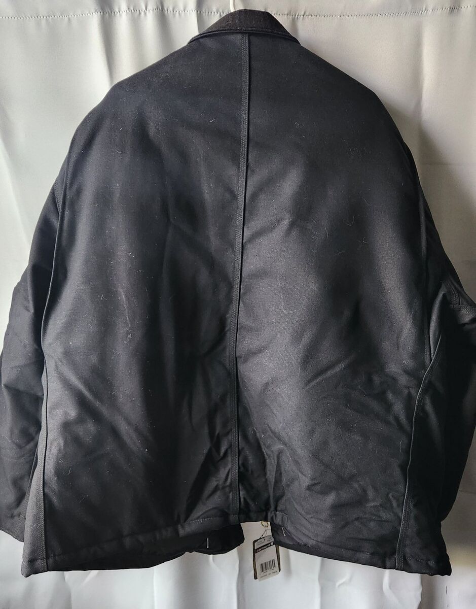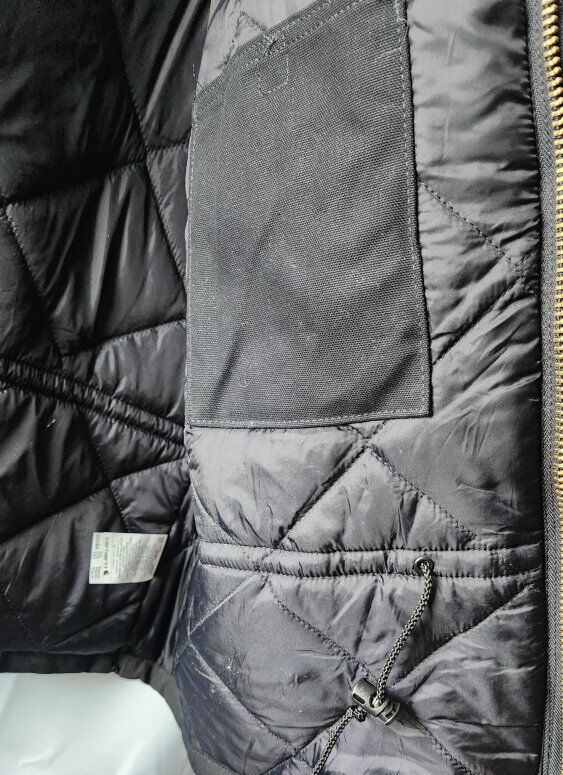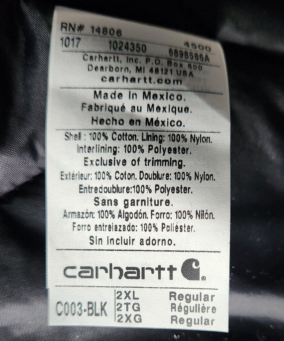 12-ounce, heavyweight firm-hand, 100% ringspun cotton duck Quilted nylon lining for easy on and off; Arctic weight polyester insulation for ultimate warmth Carhartt-strong, triple-stitched main seams Pleated bi-swing back for extra stretch across the shoulders Corduroy-trimmed collar with hidden snaps for attaching optional hood Full two-way brass zip front with hook-and-loop storm flap Internal rib-knit storm cuffs with ergonomically shaped sleeve hems help keep out the cold Two chest pockets with flap and hook-and-loop closure Two large lower-front pockets Two inner pockets