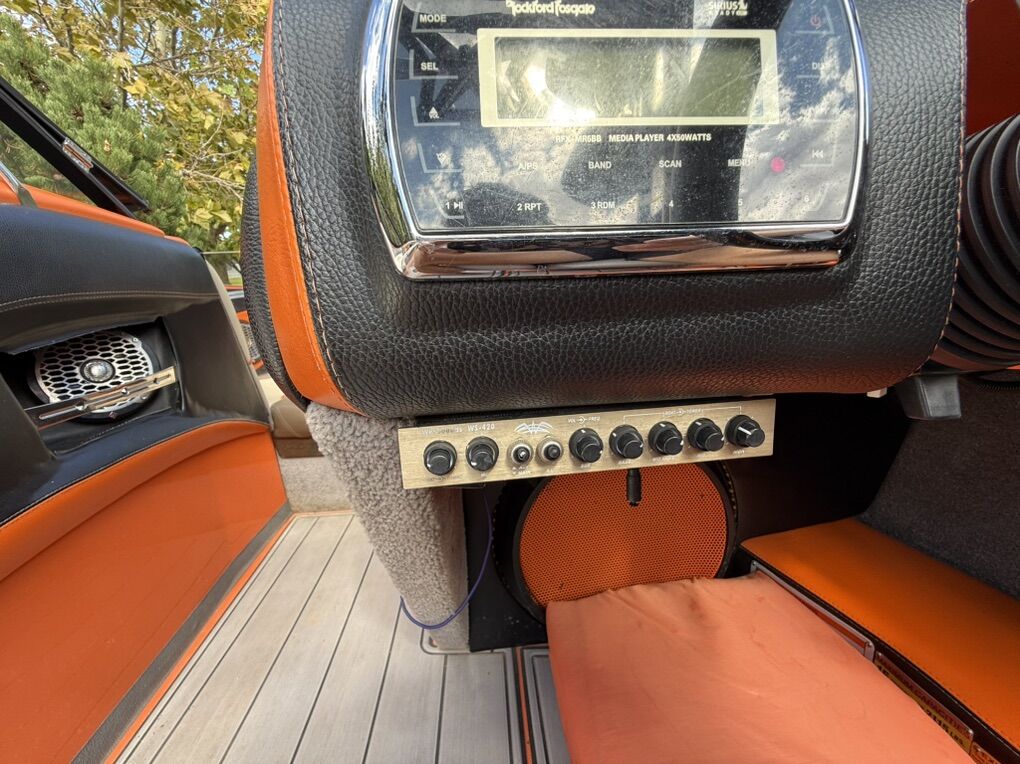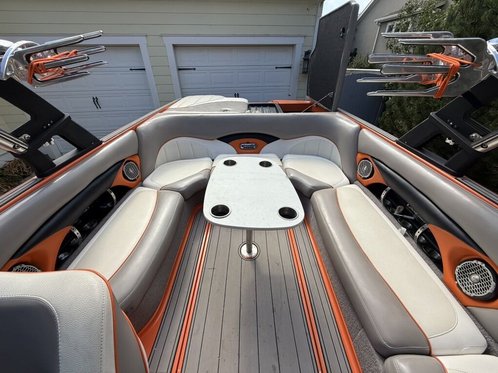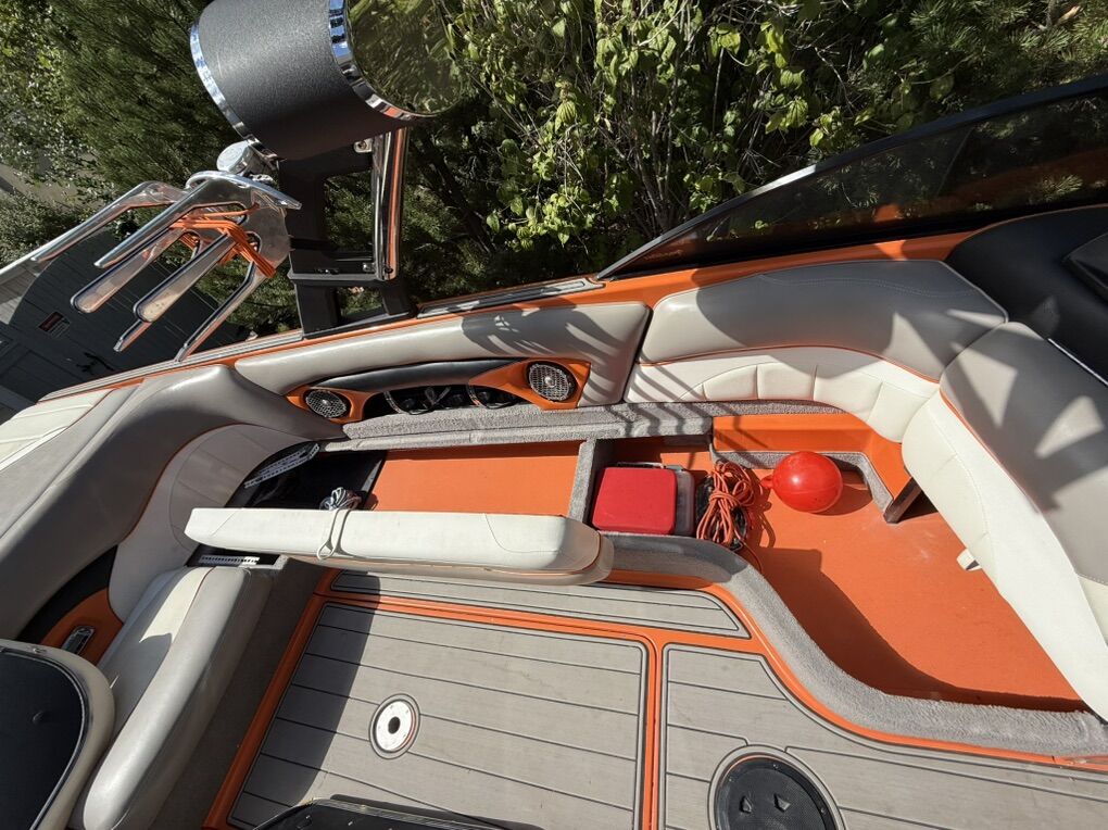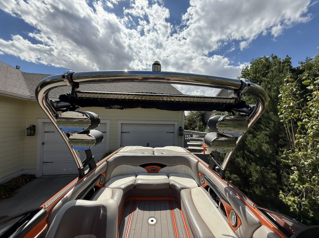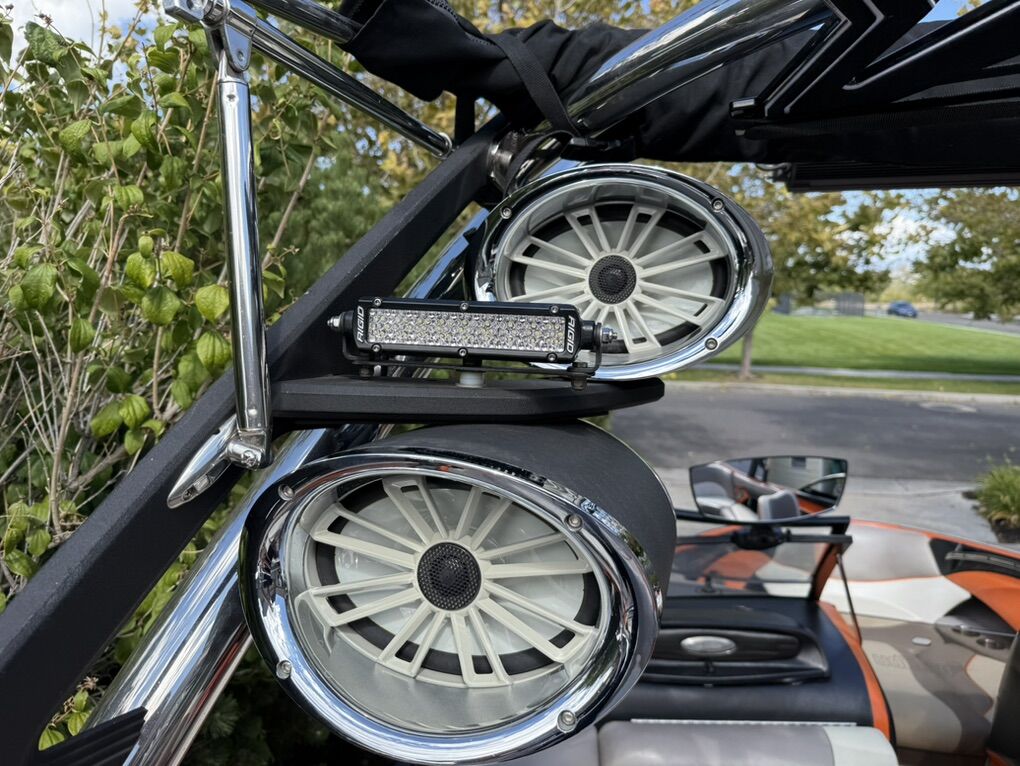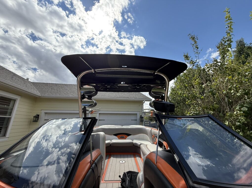 Features & Upgrades: •Evolution tabs were installed for a great wake set up •Power Wedge for adjustable wake shaping •Ballast system for surfing and wakeboarding, hard tanks in front, middle and rear. Fat sacks in rear •Premium stereo system with tower speakers & subwoofer •Touch screen dash controls •Bimini top & full travel boat cover •Tower with swivel board racks & lights •Tower is collapsible for storage •Spacious wrap-around seating with storage •2 extra storage racks for surfing boards •Netted storage racks for drying life jackets •Full lighting system for evening surfing