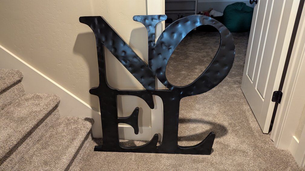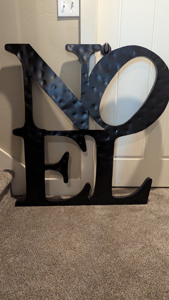 VenmoDark brown/black metal sign from Pottery Barn. It's 36 inches wide and 37.5 inches tall. It's a large sign. Hangs from the back with two hangers that are attached to the sign. It's pretty lightweight, not as heavy as it looks. It's a beautiful Christmas sign. No scammers please!