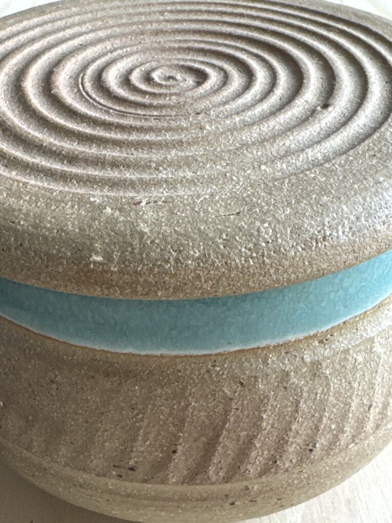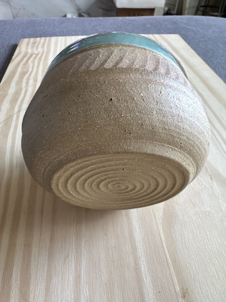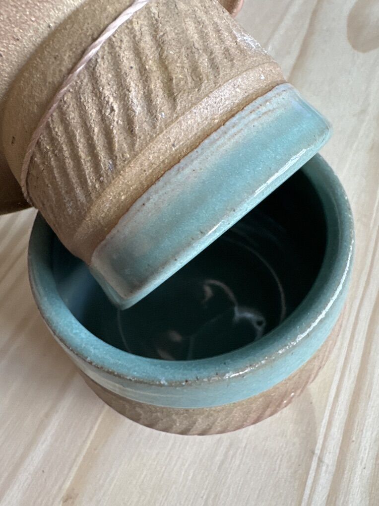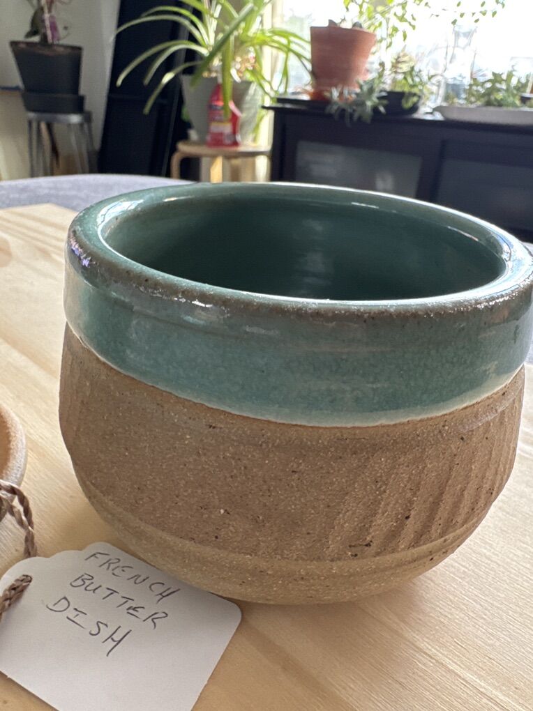 VenmoFrench Butter Dish - $12 Handmade Ceramic Bowl with a distinctive two-toned glaze, featuring a teal blue interior and upper rim, and a natural, unglazed and lightly glazed, textured lower portion in a tan or oatmeal color.