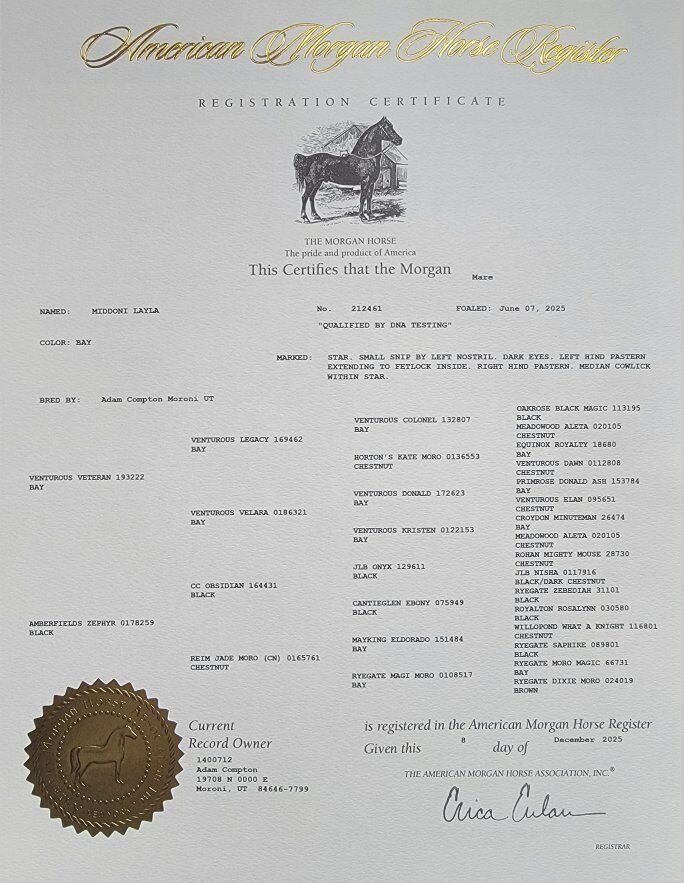 CashAppI have a 7 month old registered Morgan filly for sale. Her name is Layla. She has been started with some halter and ground work. Layla is not gated but both parents can be pushed to keep up with gated horses. The last pictures are of her Sire and Dam. $2,500 call or text for more info.