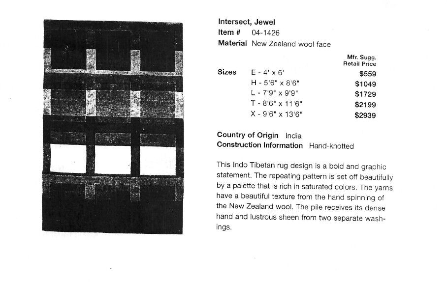 Ethan Allen Intersect Jewel 5'6 x 8'6" Rug. Over $1200 at Ethan Allen. It's a nice piece to add "a touch of contemporary elegance to your home decor". "Bold and graphic with a palette of deeply saturated colors and an Indo-Tibetan weave, this rug is crafted of hand-spun New Zealand wool. Its pile gets its dense hand and lustrous sheen from two separate washing. Made of 100% New Zealand wool. Made in India. Hand-knotted. Use a rug pad to extend the life of the rug and your floor." Located in Sugarhouse Park area.