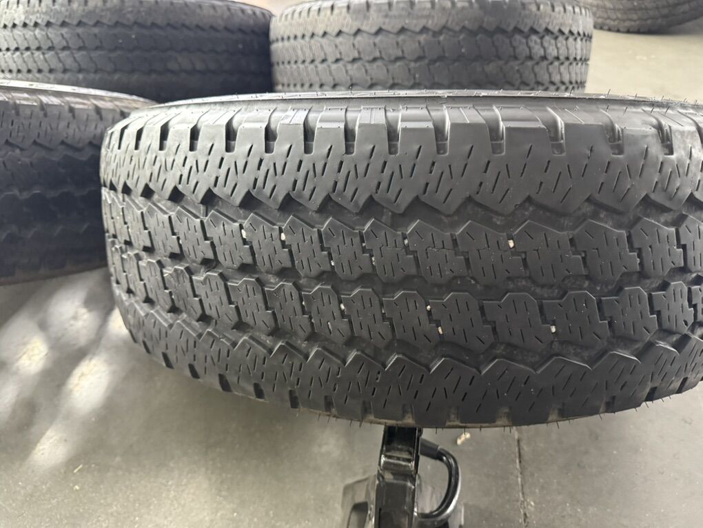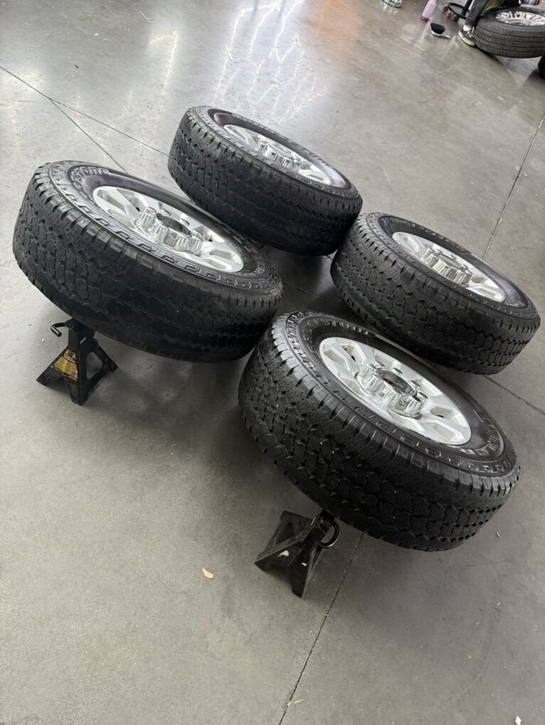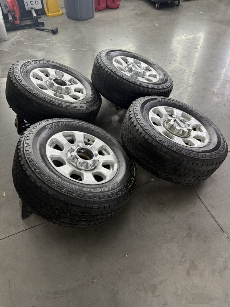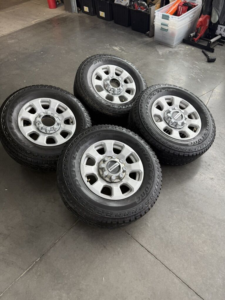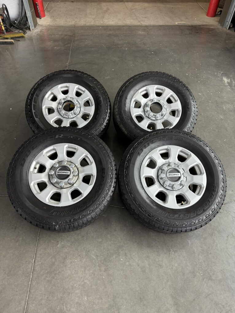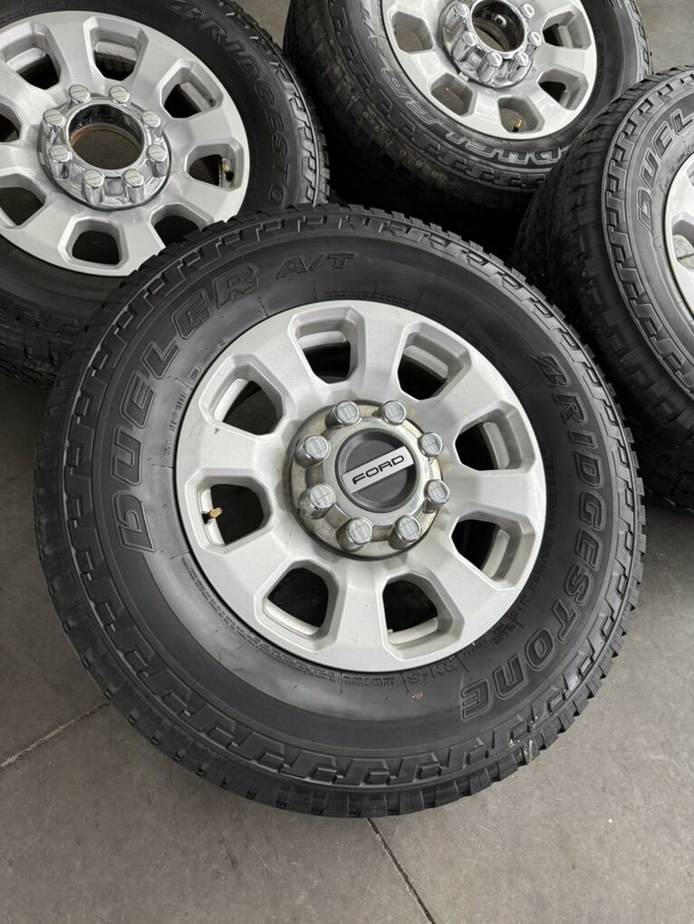 Wheels are 18in OEM wheels off a 2024 ford d350 superduty pickup. Wheels are in great shape, no curb rash or major damage on them, Great looking set of f350 takeoffs. All the center caps are also included and in amazing shape as well. Tires are 275/70/18 Bridgestone dueler all terrain, load range E, top of the line tires, no patches or plugs in them, low miles tires have about 70-75% tread left