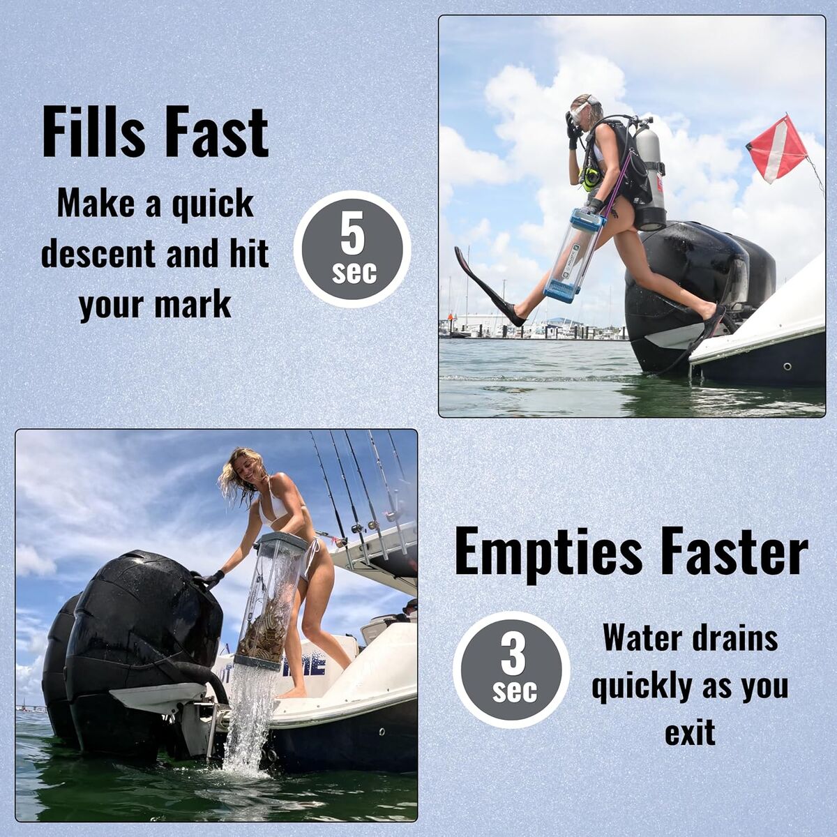Safe and See Through - Safe means no contact with venomous fish spines. Easy Splash & Exit - Fills and drains almost instantly. Flat Pack Assembly for Travel & Environmentally friendly shipping. Quick Load - Spear, Load, Next. Don't miss a fish. Empty Fast & Safely - Spend more of your surface interval relaxing.