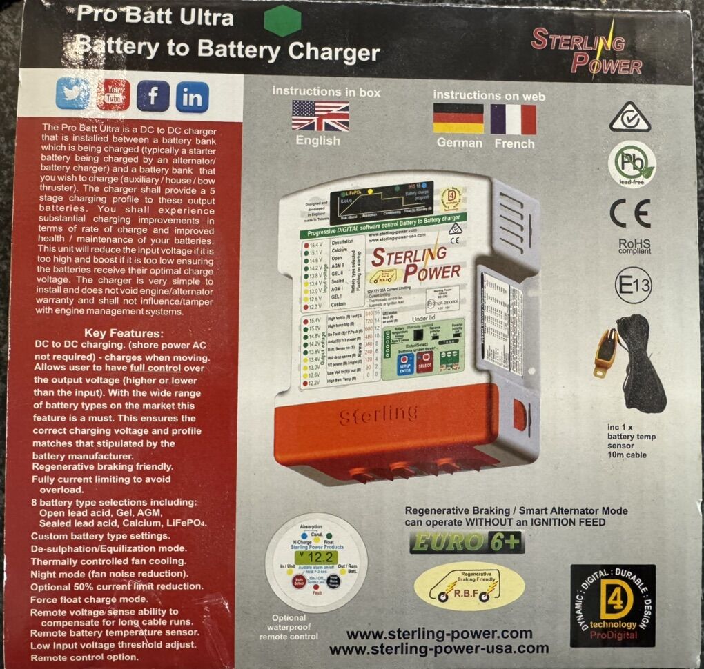 Sterling Power BB1230 digital control battery charger, designed to charge 12V batteries with a capacity of up to 30A. It is suitable for use in a marine environment or in a vehicle (camper van, rv). Part number BB1230.