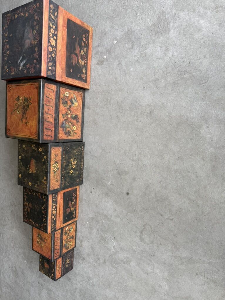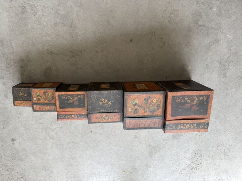 Decorative cardboard gift boxes. May be nested, stacked, or used individually. Set of 6 boxes sold as set. Sizes: 4 1/4”, 5 1/4”, 6 1/2”, 7 1/4”, 8 1/4”, and 9” all square.
