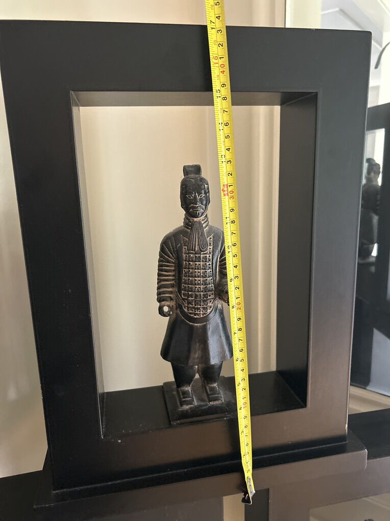 VenmoChinese Terracotta warriors replica in museum style thick black frame Also has hanging hooks on back In Excellent Condition Each warrior is 17” height x 13.5” width