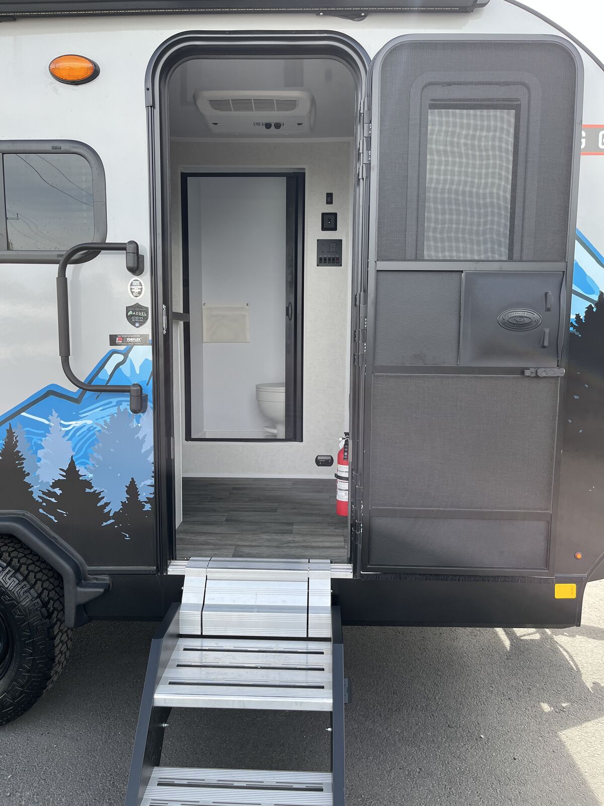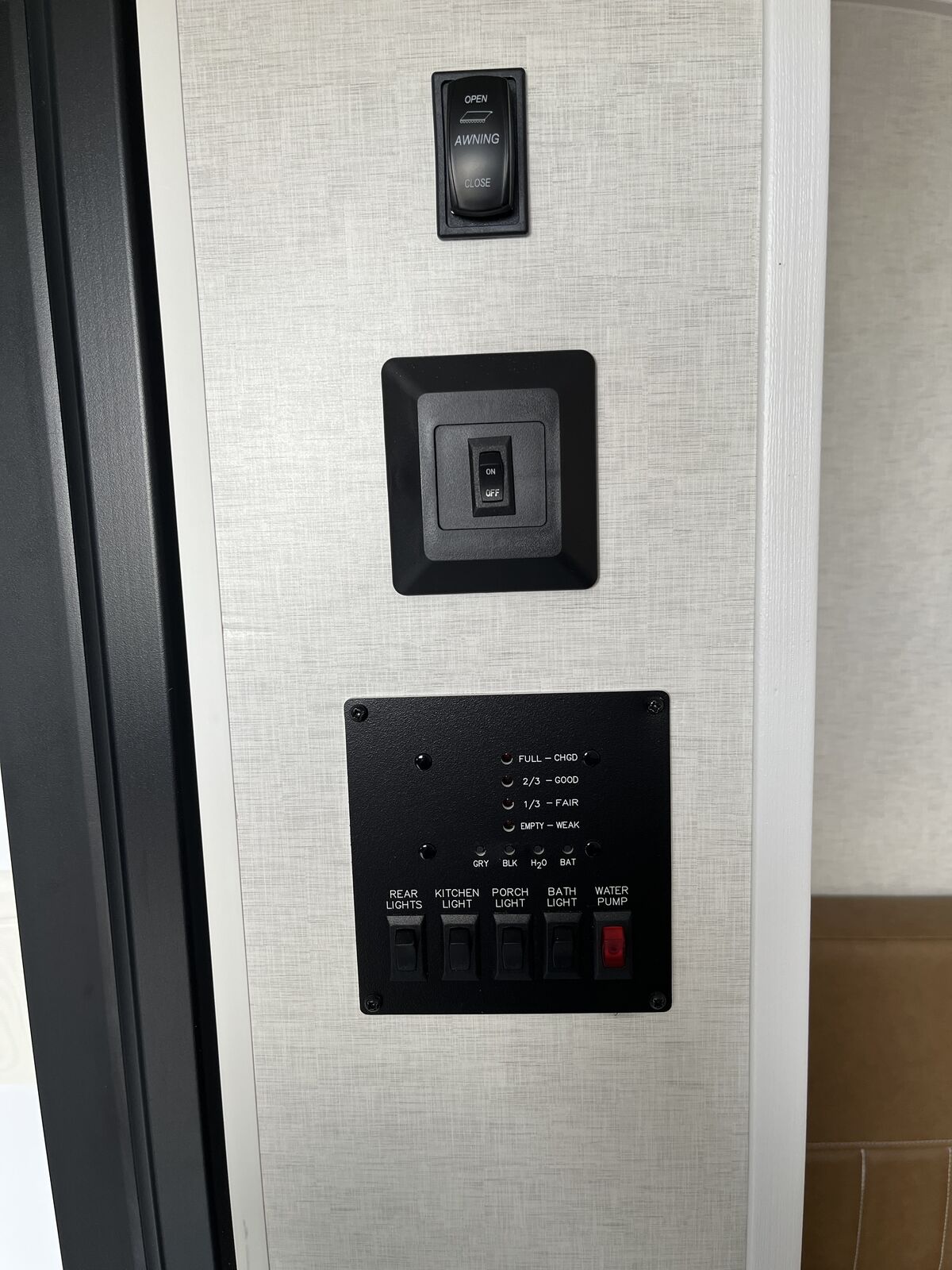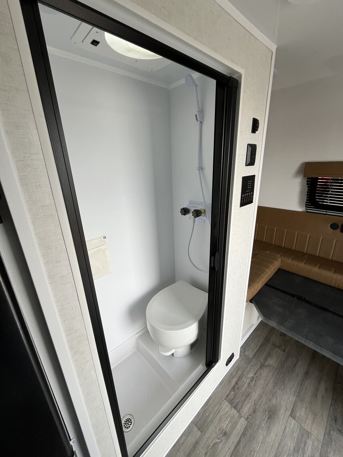 Off-Grid Power & ConvenienceRoof-mounted solar panel and lithium battery system 110V, 12V, and USB outlets for all your devices On-demand water system with outdoor shower Awning included for shaded outdoor living space