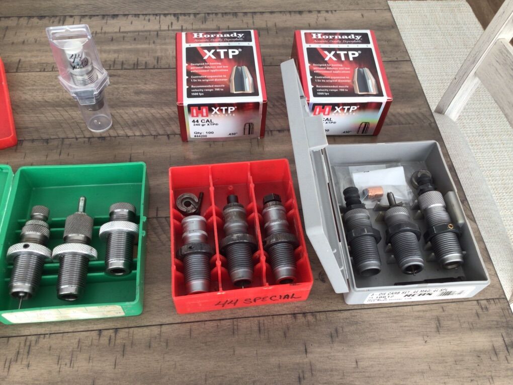 Two 44 magnum rcbs die sets One durachrome 44 special die set One Lee 44. Mag bullet seater Two boxes of Hornady, 240 grainbullets 160 bullets