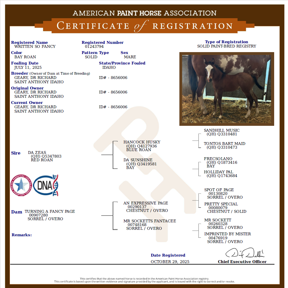 “Quill” aka Written So Fancy, is an APHA registered filly born July 11, 2025. She is out of our APHA mare Turning a Fancy Page and by our stud Da Zeas. She comes from halter and working ranch horse bloodlines so should do well with just about anything you throw at her! Her mom is a sorrel overo paint mare, and her dad is a bay roan.