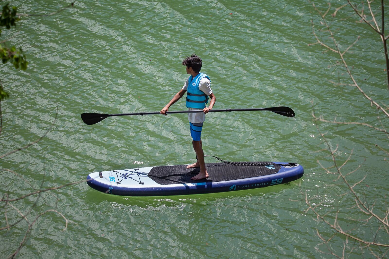 -Two Layer Construction:2-PLY Construction is the superior material in durability, rigidity, and control out on the water. -6" Drop-Stitch Technology:This amazing technology allows STAGE paddleboards to be incredibly stable and rigid, thanks to the tens of thousands 6" fibers in-between the board. -9'x31"x6" Design:These dimensions are perfect for teens and adults who weigh between 80lbs and 130lbs. This size is ideal for easy turning, easy transportation, and a more manageable board overall. -Non-Slip Grip Mat:The S9 Cruiser uses a non-slip grip EVA foam mat, ensuring you the best grip while paddling. -4 Point Bunge:The 4-point bungee system allows you to store your gear, paddles, shoes, and more while out on the water. -4 Deck D-Rings:Four metal D-rings allow you to attach a shoulder strap for carrying, kayak seat, paddle holders, and more. -2 Handles:A Front handle is mounted on the tip of the board, allowing you to pull the board out of the water with ease. A low profile handle located in the center of the board allowing you to easily carry the board from car to water. -High Pressure Valve:High pressure = more stable. STAGE inflatable paddleboards hold up to 15 PSI, but typically 12 PSI is the sweet spot.